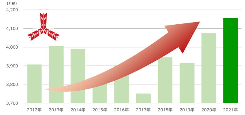 2021年の年間販売数量は、「三ツ矢」ブランドが4,162万箱(前年比102%)で、2020年の4,075万箱を超え、2年連続で過去最高の販売数量を更新しました。「ウィルキンソン」ブランドは3,108万箱(前年比105%)で、メガブランドと位置付けられる3,000万箱の大台を1904年の発売から初めて突破し、14年連続で過去最高の販売数量を更新しました。