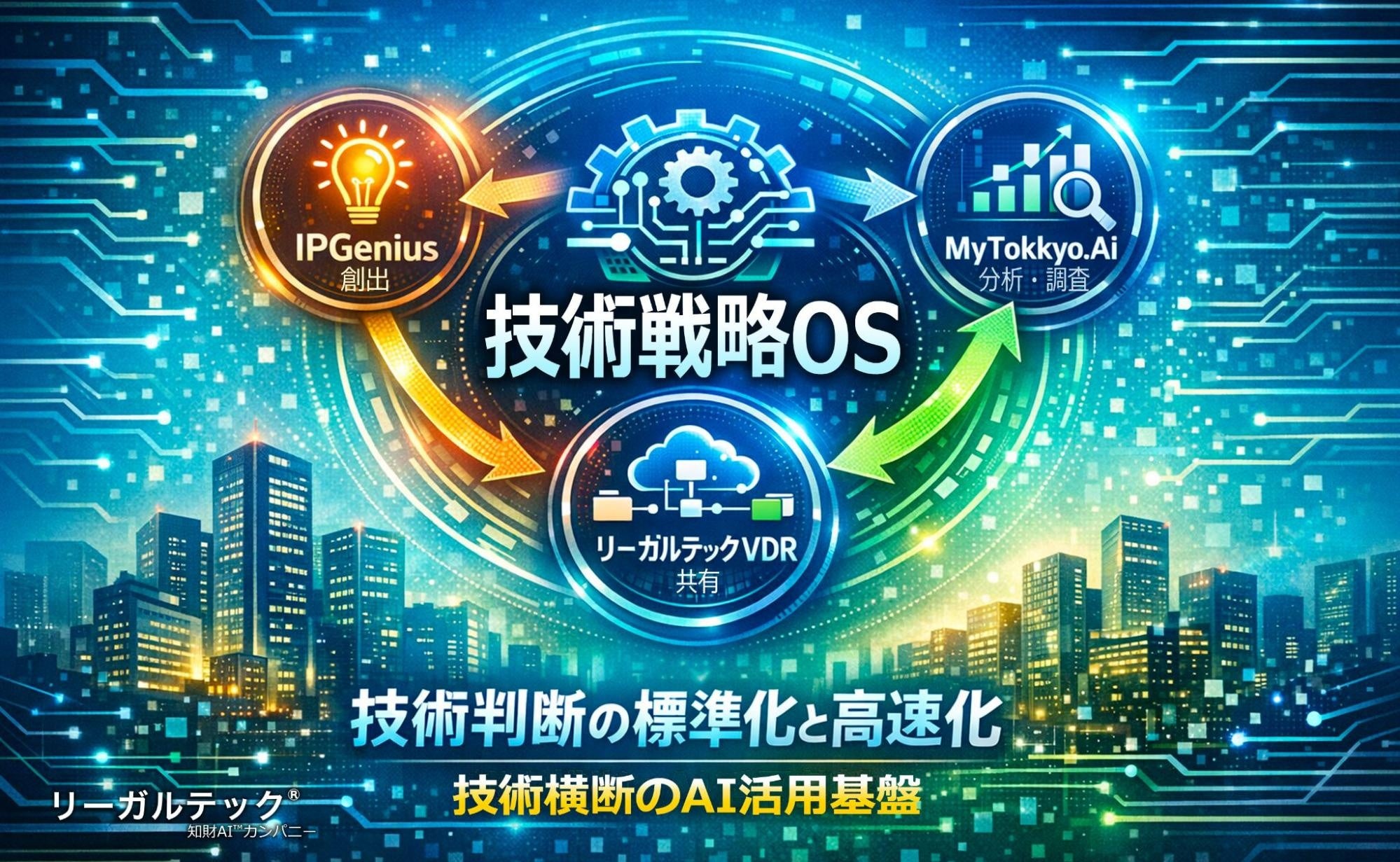 リーガルテック株式会社(東京都港区:代表取締役社長 平井 智之)は、研究開発・知財・事業企画が共通の仕組みでAIを活用し、技術判断を標準化・高速化する企業内基盤として「技術戦略OS」を提供開始した。本基盤は、発明創出プラットフォーム「IPGenius」、特許・技術分析基盤「MyTokkyo.Ai」、技術情報共有基盤「リーガルテックVDR」を統合し、企業の技術活動と経営判断をデータドリブンで支援する。