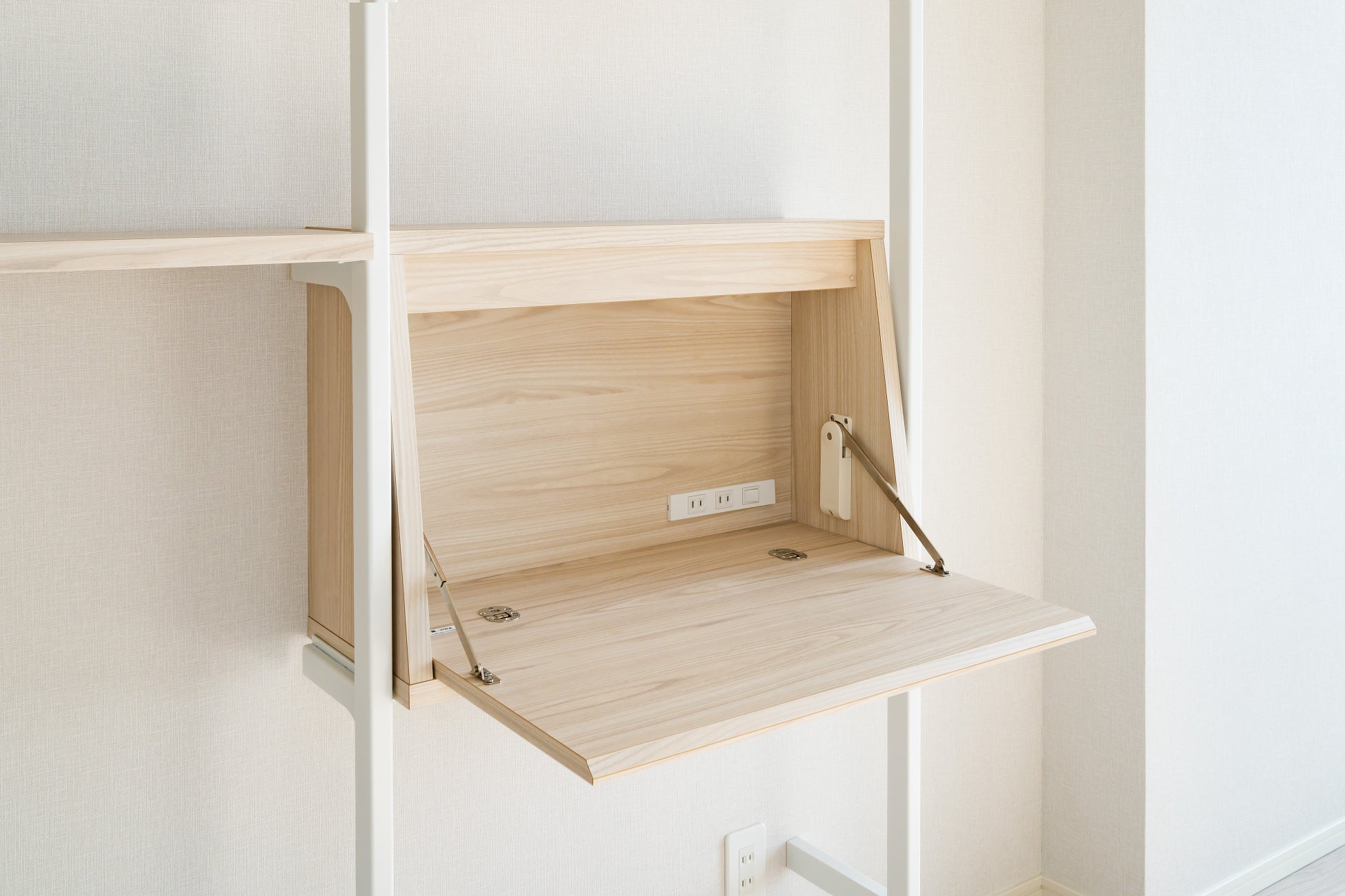 コンセント・照明付きで使う時だけ開けて、使わない時は収納できるデスクを取り付け可能。