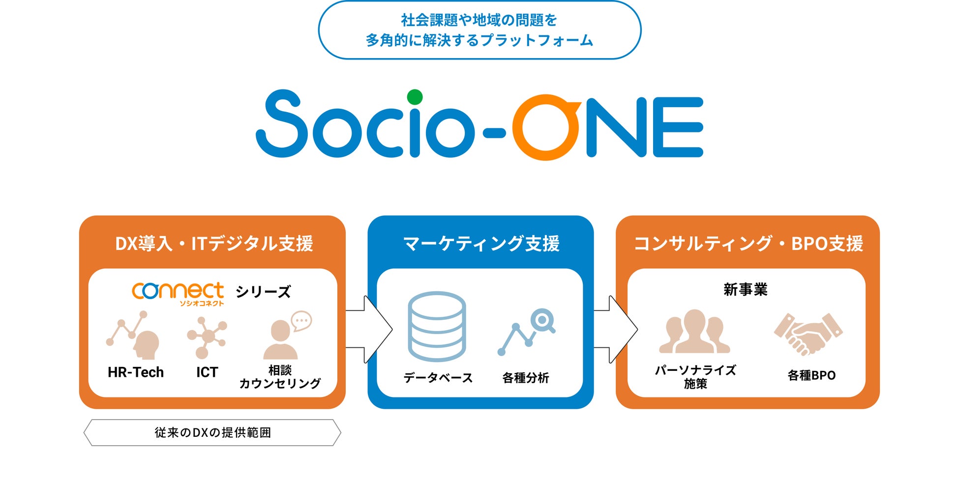 ソシオークヒューテックは、独自のプラットフォーム「Socio-ONE」を活用し、ITの提案・開発・導入・分析を通じてDXを推進します。これにより、①自治体や企業(サービス提供元)、②現場(サービス提供者)、③利用者(市民・お客様)の三者を「つなげる」ことで、社会課題(ソーシャルビジネス)と地域課題(自治体ビジネス)の解決に「つなげる」ことに貢献します。そして、すべての人が安心して暮らせるより良い社会・より良い未来へ「つなげる」ことを目指してまいります。