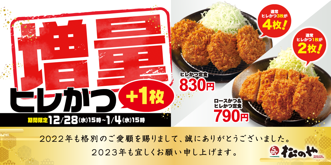 株式会社松屋フーズ(本社:東京都武蔵野市、代表取締役社長:瓦葺 一利)では、とんかつ専門店の「松のや・松乃家」におきまして、2022年12月28日(水)午後3時より、お値段変わらずにヒレかつを1枚増量できる「ヒレヒレフェア」を開催いたします。