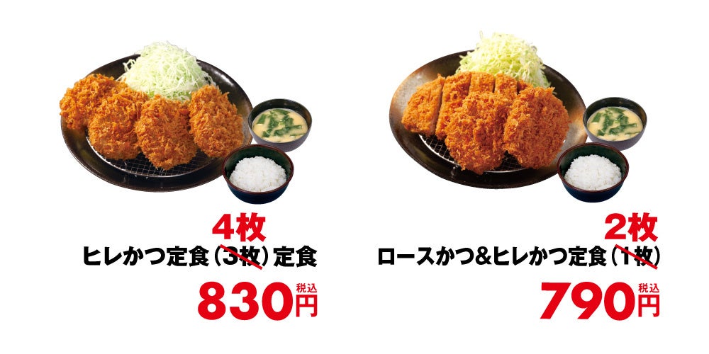 | 商品名 ヒレかつ定食(3枚⇒4枚) 830円 ロースかつ&ヒレかつ定食(1枚⇒2枚) 790円 ※全て税込価格です。また、店内・お持ち帰りの税込価格は同一です。 ※お持ち帰りいただけます。お持ち帰りのみそ汁は、別途60円でお買い求めいただけます。 ※本キャンペーン期間中の「ロースかつ&ヒレかつ1本定食」の販売はいたしません。 フェア期間 2022年12月28日(水)午後3時~2023年1月4日(水)午後3時 対象店舗 一部店舗を除く全国の松のや・松乃家 ※高速PA店舗を除く。 |