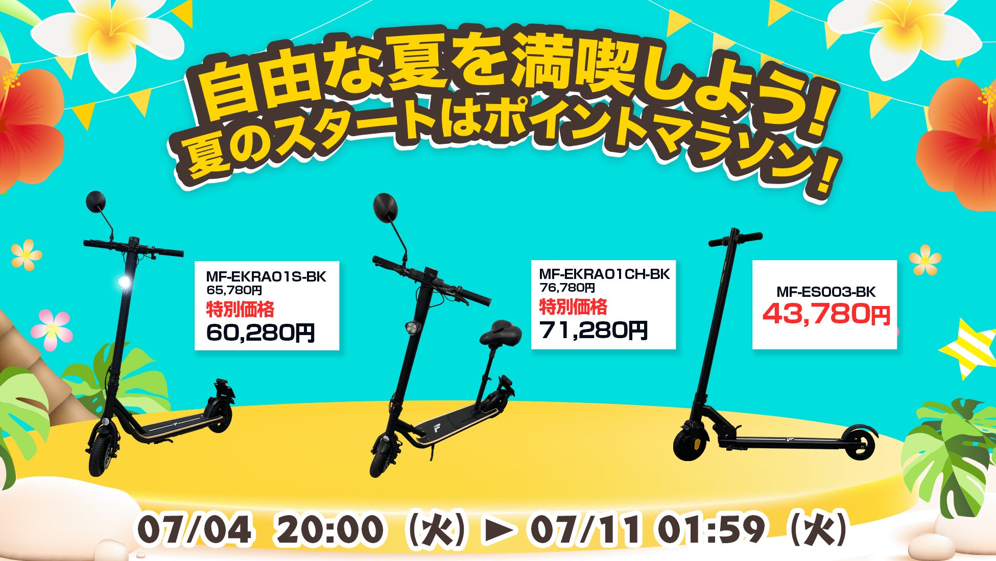 楽天「Show !t」自由な夏を楽しむレジャーにおすすめ、公道走行対応電動キックボードの5,000円オフセールを開催。さらに7月4日(火)20時から全商品ポイント10倍、楽天お買い物マラソンに参加。