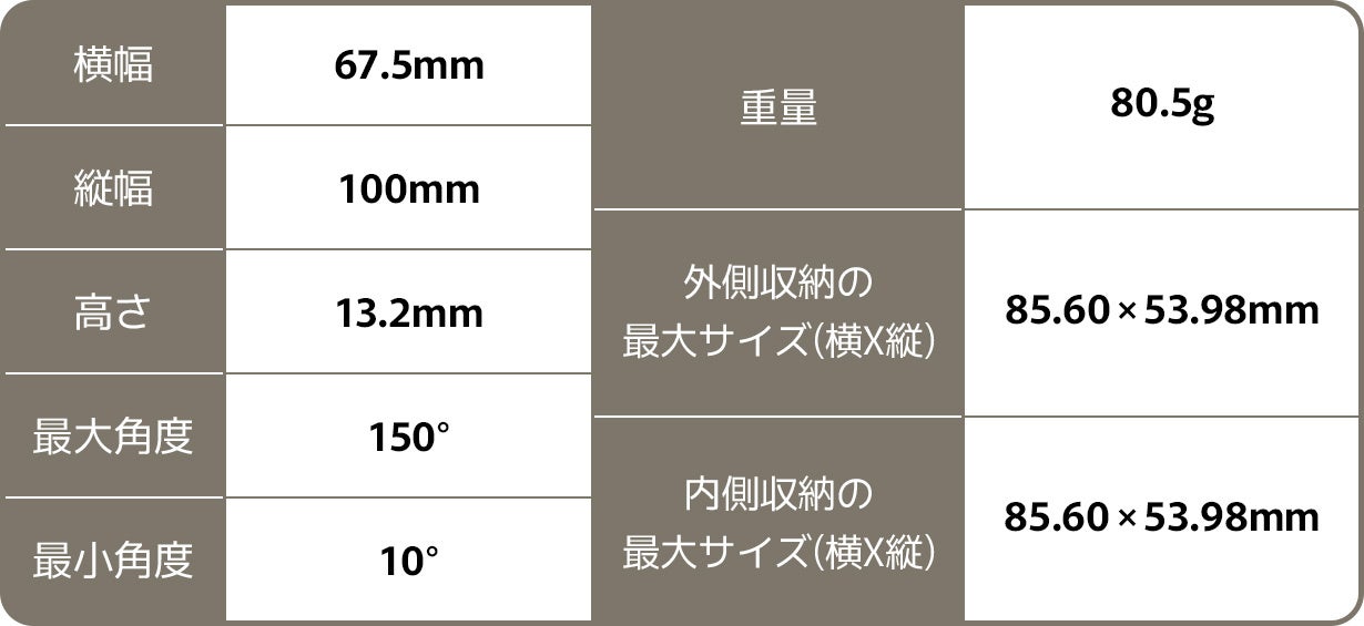 お好きな角度や方向でいつでも便利にスマートフォンを設置することができます。メタルヒンジが適用された一体型折りたたみ構造により、10°から150°までの角度調整が可能です。また、カメラの干渉なく横向きモードと縦向きモードとの完全な互換性を備え、自由に設置して使用することができます。