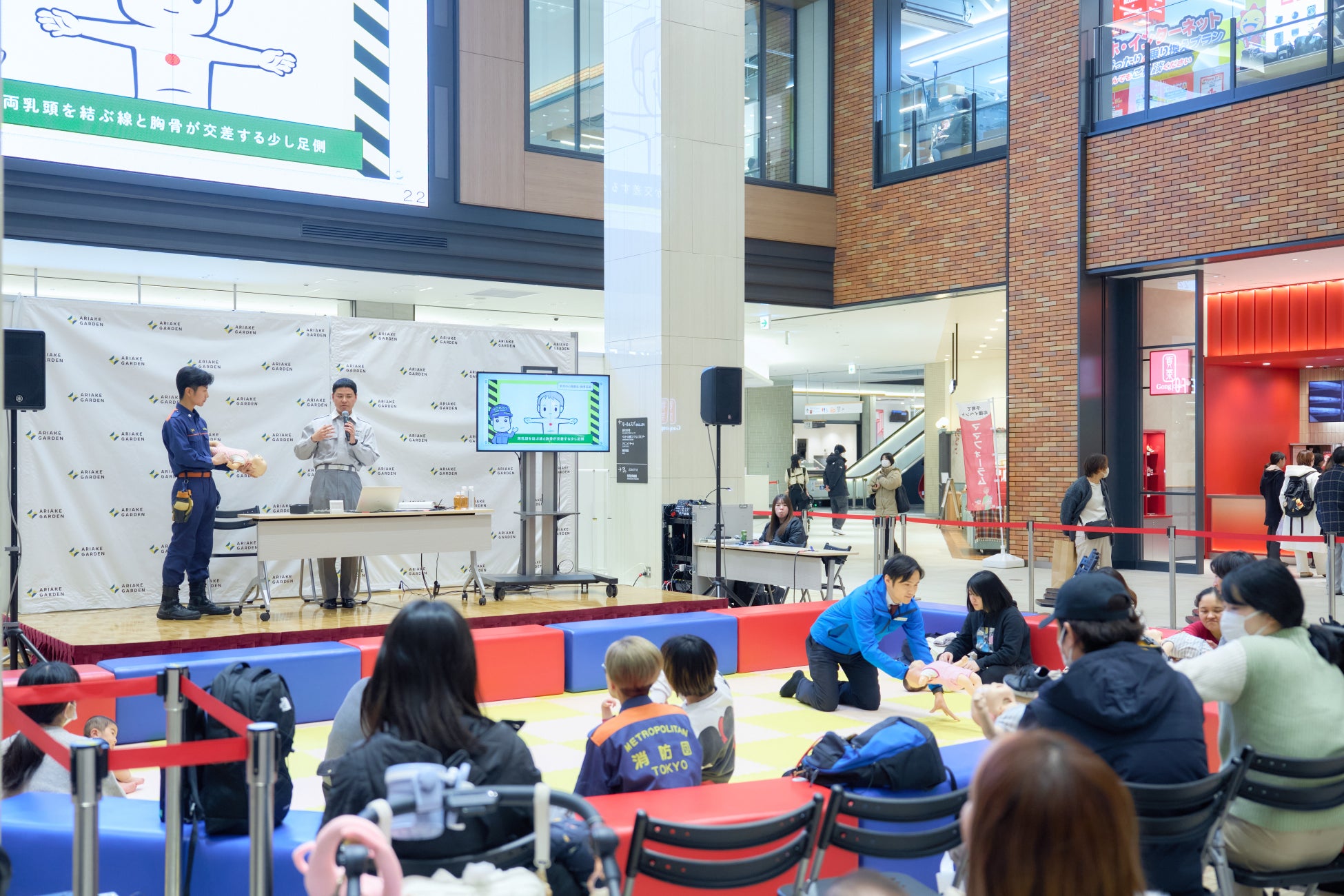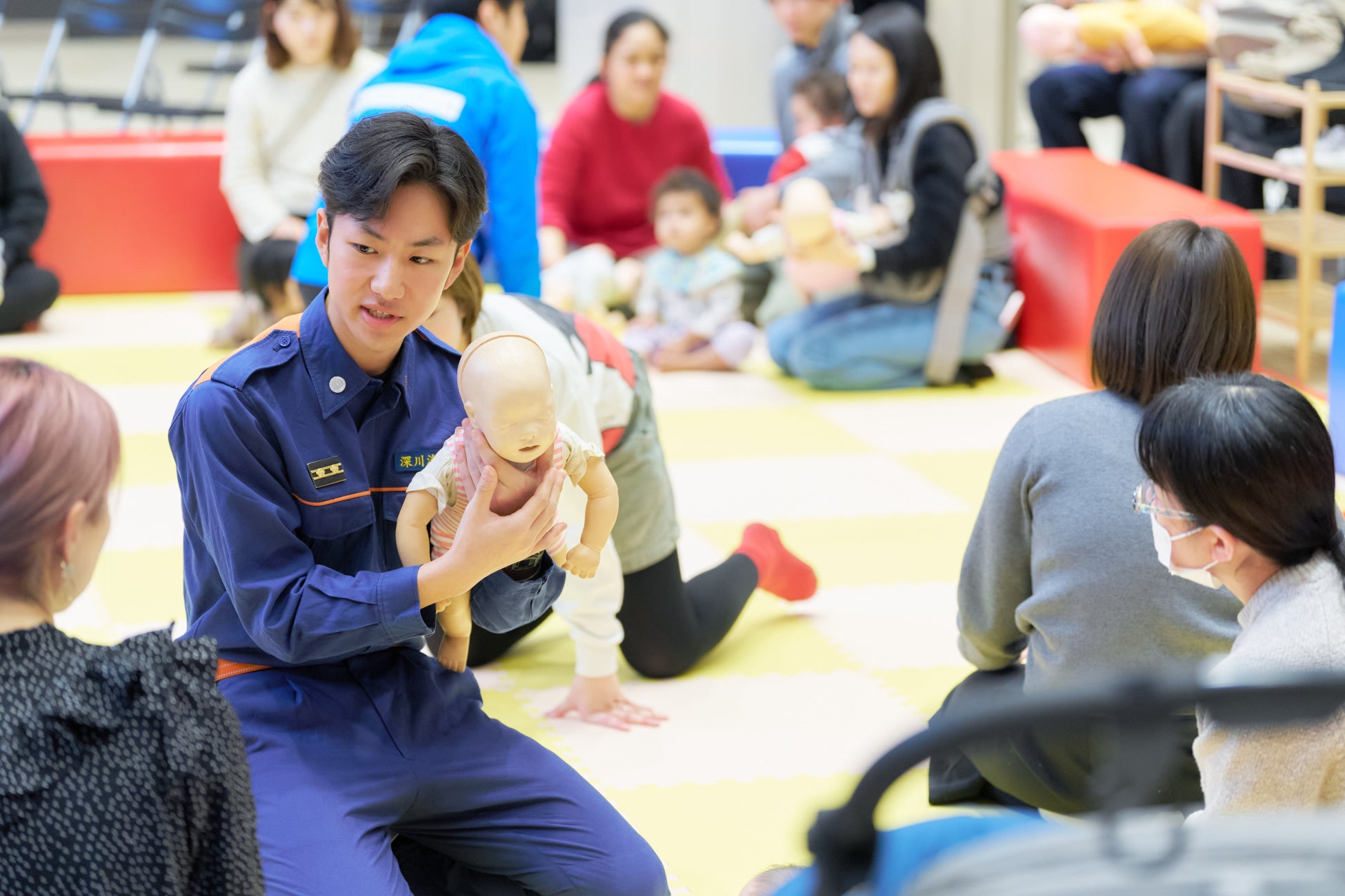 東京消防庁深川消防署の救急救命士及び深川消防団第10分団員による、乳幼児の窒息や誤飲、転落、やけどなど、日常生活で起こりやすい事故への対応方法を実技を交えて解説するステージイベントを実施しました。当日は、当社社員の「応急手当普及員」2名も参加し、来場者への説明を行いました。