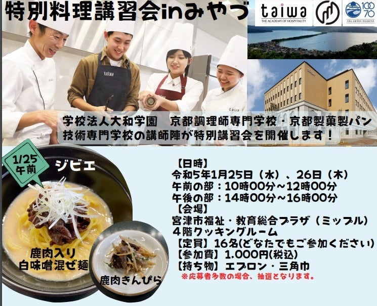 学校法人大和学園 京都調理師専門学校・京都製菓製パン技術専門学校の講師陣が京都府宮津市にて「特別料理講習会」を開催します。ぜひこの機会に、宮津市へお越しください。