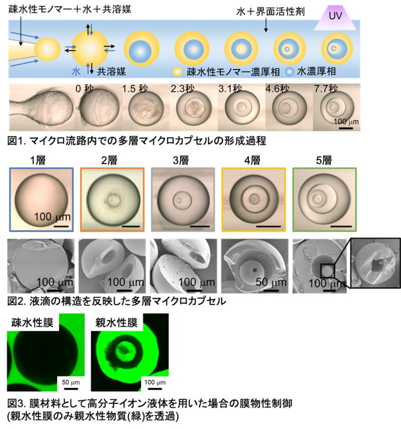 また、原料の送液速度や初期組成、膜物質の化学構造を変えることによって、マイクロカプセルの直径や膜の層数、分子透過性などを精密に制御できることも示しました。