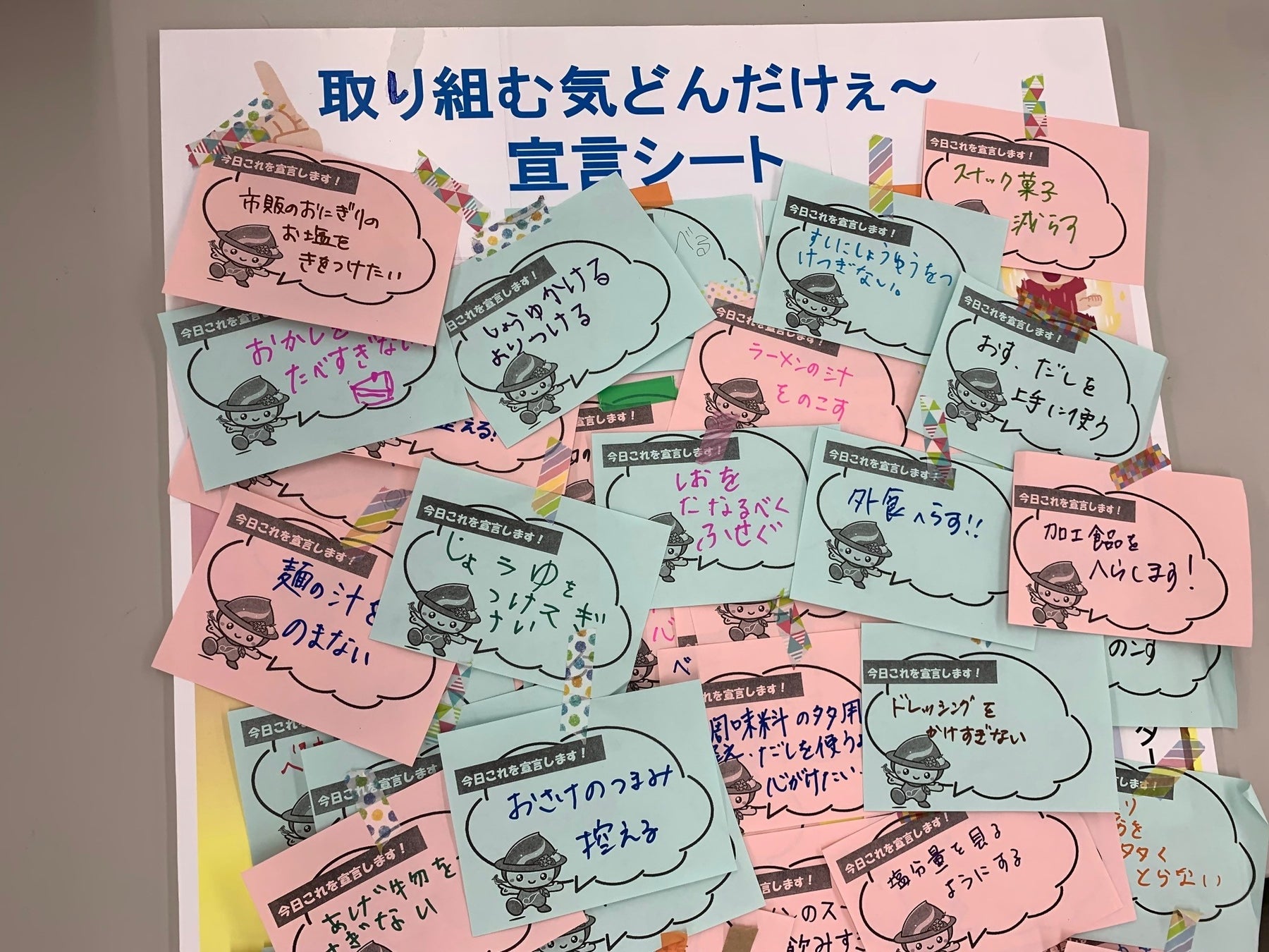 市民の生活習慣病の発症及び重症化予防に向けた取組である「さがみはら街ぐるみ減塩プロジェクト」では、様々なイベントなどで、市民に向けた減塩の取組を発信しています。また、市民の皆さんからの“減塩宣言”もたくさん集まっています。