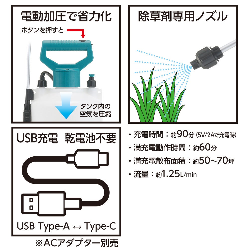 ④満充電後(5V/2Aで約90分)、約60分間作業可能、50~70坪に散布できます。