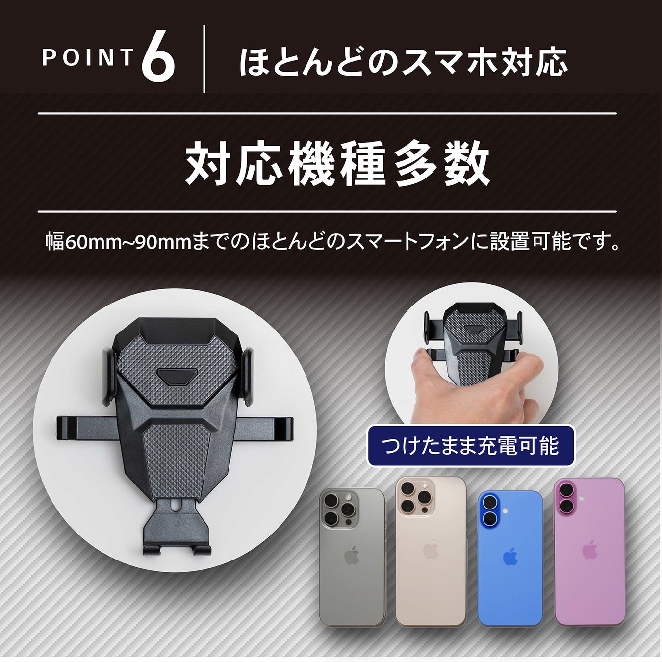 幅60mm~90mmまでのほとんどのスマートフォンを設置可能です。