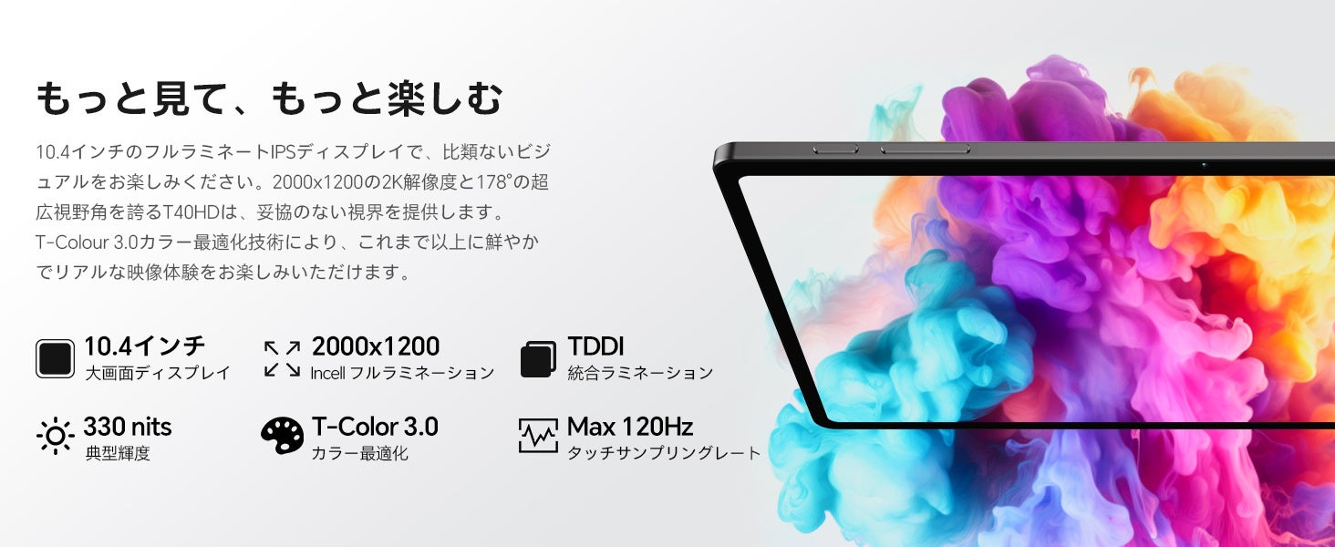 10.4インチのフルラミネートIPSディスプレイで、比類ないビジュアルをお楽しみください。2000x1200の2K解像度と178°の超広視野角を誇るT40HDは、妥協のない視界を提供します。T-Colour 3.0カラー最適化技術により、これまで以上に鮮やかでリアルな映像体験をお楽しみいただけます。最先端のTDDIテクノロジーとincellタッチスクリーンを採用し、最大120Hzのタッチサンプリングレートを実現しました。