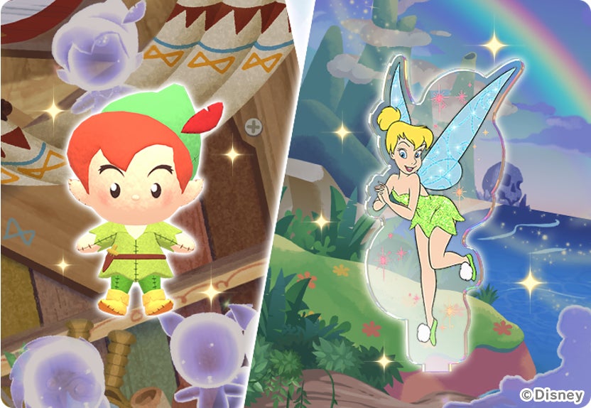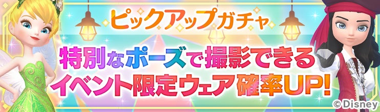 「ピーター・パン ネバーランドの大冒険」ピックアップガチャでは、「ティンカー・ベルの妖精ドレス」「フック船長のパイレーツウェア」が期間限定で登場し、提供割合がアップします。