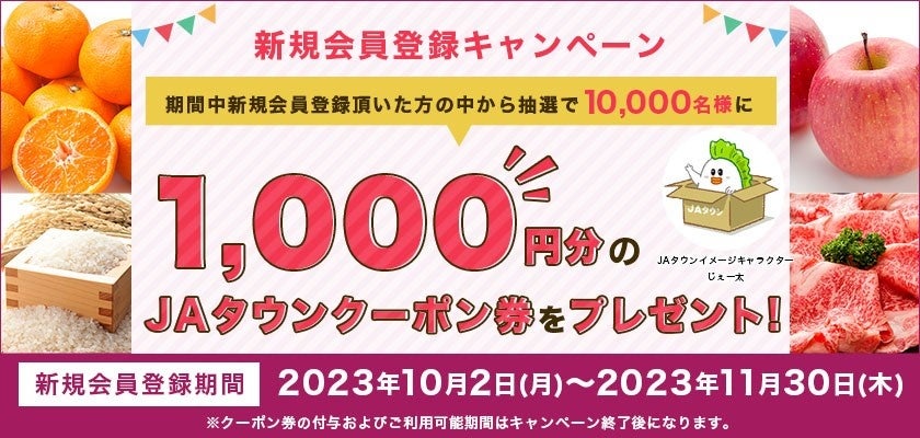 1.内 容:期間中新規会員登録頂いた方の中から抽選で10,000名様に1,000円分のJAタウンクーポン券をプ