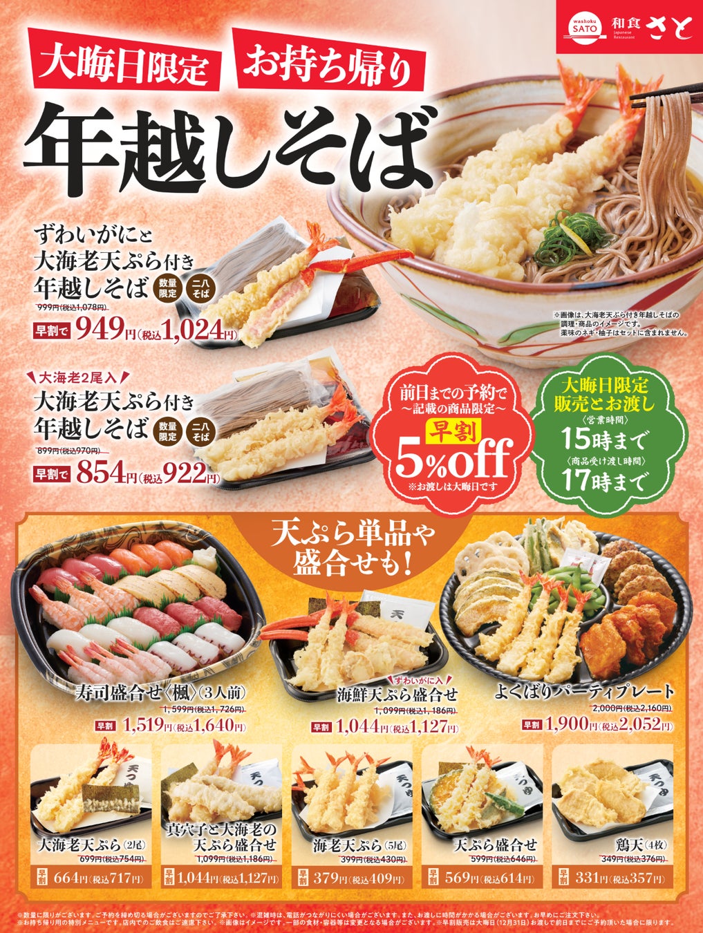 ■大海老天ぷら2尾付きの「和食さとの年越しそば」!!前日までの「早割5%OFF」がお得!!