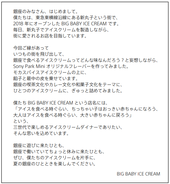 その第2弾では、東急東横線沿線にある新丸子(神奈川県川崎市)の街で行列のできる話題のアイスクリームショップ「BIG BABY ICE CREAM」とコラボレーションし、真夏の12日間限定でSony Park Miniだけのオリジナルフレーバーのアイスクリームが楽しめるプログラム「Mini BIG BABY ICE CREAM 銀座」を開催します。開催期間は2023年7月27日(木)~8月7日(月)です。