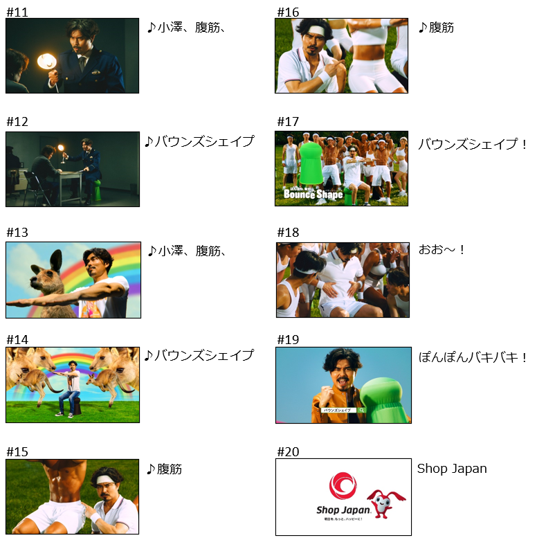 「小澤ぽんバキ」篇では、「小澤 腹筋 バウンズシェイプ♪」のリズムに合わせて様々なシチュエーションでバウンズシェイプを使用しています。最後のシーンでの「ぽんぽんバキバキ!」と叫びながらの決めポーズは必見です。簡単に「ながら腹筋運動」ができるということをコミカルに描いた、思わず笑顔になってしまうようなCMとなっております。