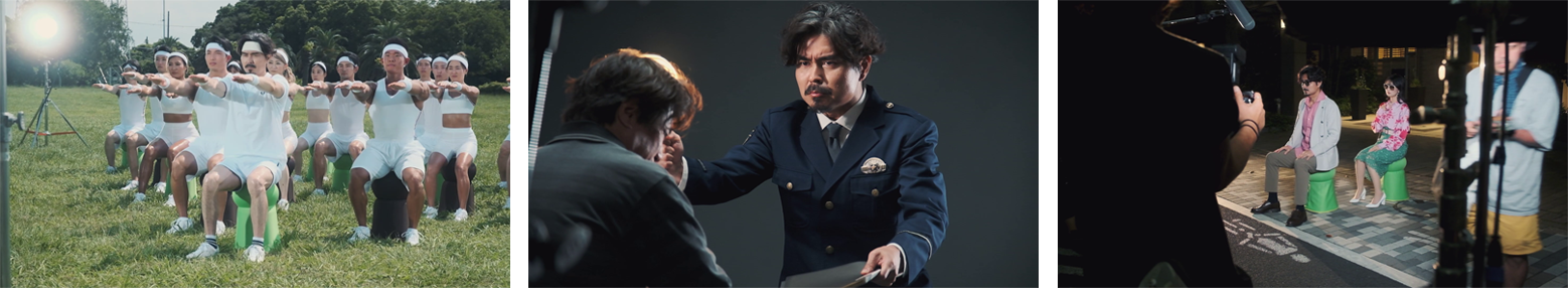 公園のシーンでは炎天下の中、たくさんのエキストラと共にバウンズシェイプ。全員が息ぴったりに動きを合わせるために一人ひとりに声をかける場面が印象的でした。
