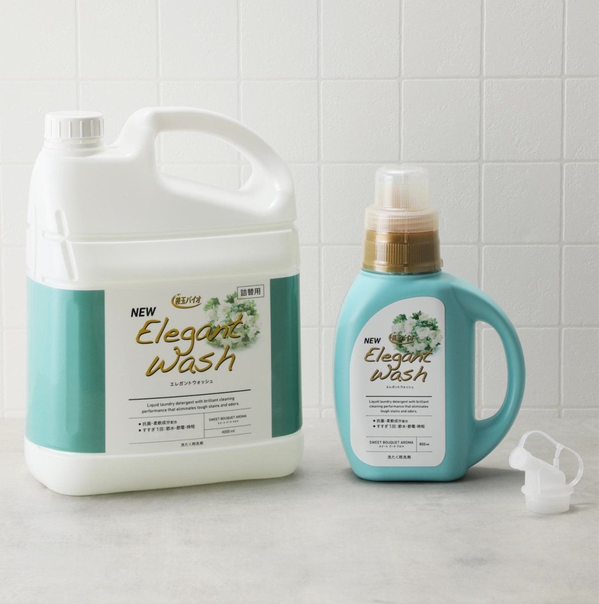 「エレガントウォッシュ」は柔軟剤入り日常洗濯洗剤です。善玉バイオを配合しており、優れた洗浄性能でありながら、中性で衣類にやさしい設計のため、おしゃれ着をはじめとする幅広い衣類に使用することができます。