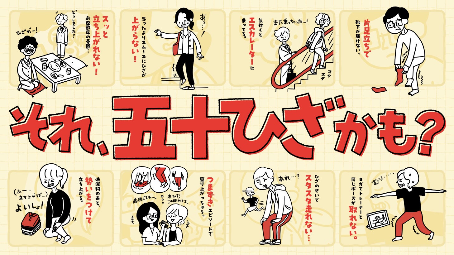 「ひざを気にする年齢はまだまだ先」と考えている方も多いのではないでしょうか。しかし実際には、ひざに違和感を覚え始める平均年齢は50.5歳*と、皆さまが思っているより早くエイジングが始まっているのです。ひざは趣味や運動だけでなく、日常生活にも影響を及ぼす、ウェルエイジングな毎日を送るために重要な部位の一つです。そこで当社では、50代から感じ始める"ひざの曲げ伸ばしの違和感"を「五十ひざ」と定義し、早めのケアを推進するはこびとなりました。