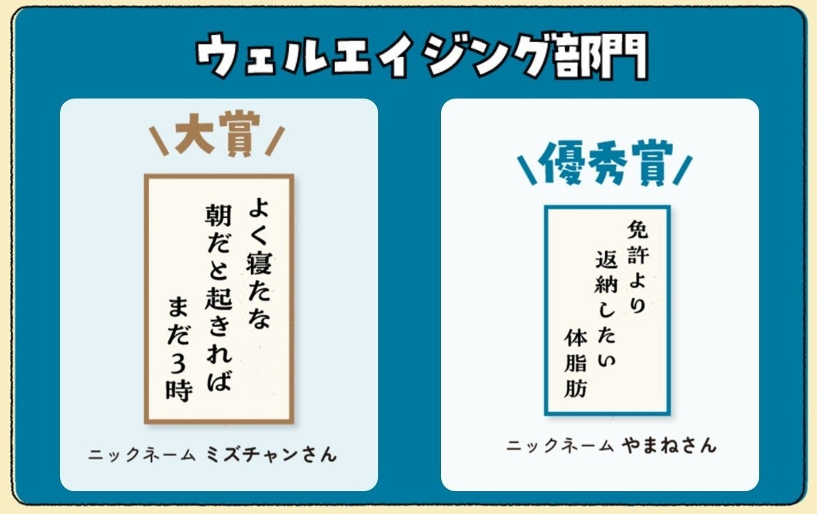 キューサイ株式会社(本社:福岡市中央区、代表取締役社長:石川 順朗)は、10月8日(水)~10月27日(月)まで開催した『第3回キューサイウェルエイジング川柳大賞』の受賞作品を発表いたします。本キャンペーンは年齢を重ねることを前向きに捉える「ウェルエイジング」という考えをより身近に感じていただくことを目的に実施され、「健康」をテーマに、ご自身が年齢を重ねることで感じる「カラダの変化や不調にまつわるあるある」を五・七・五で募集しました。