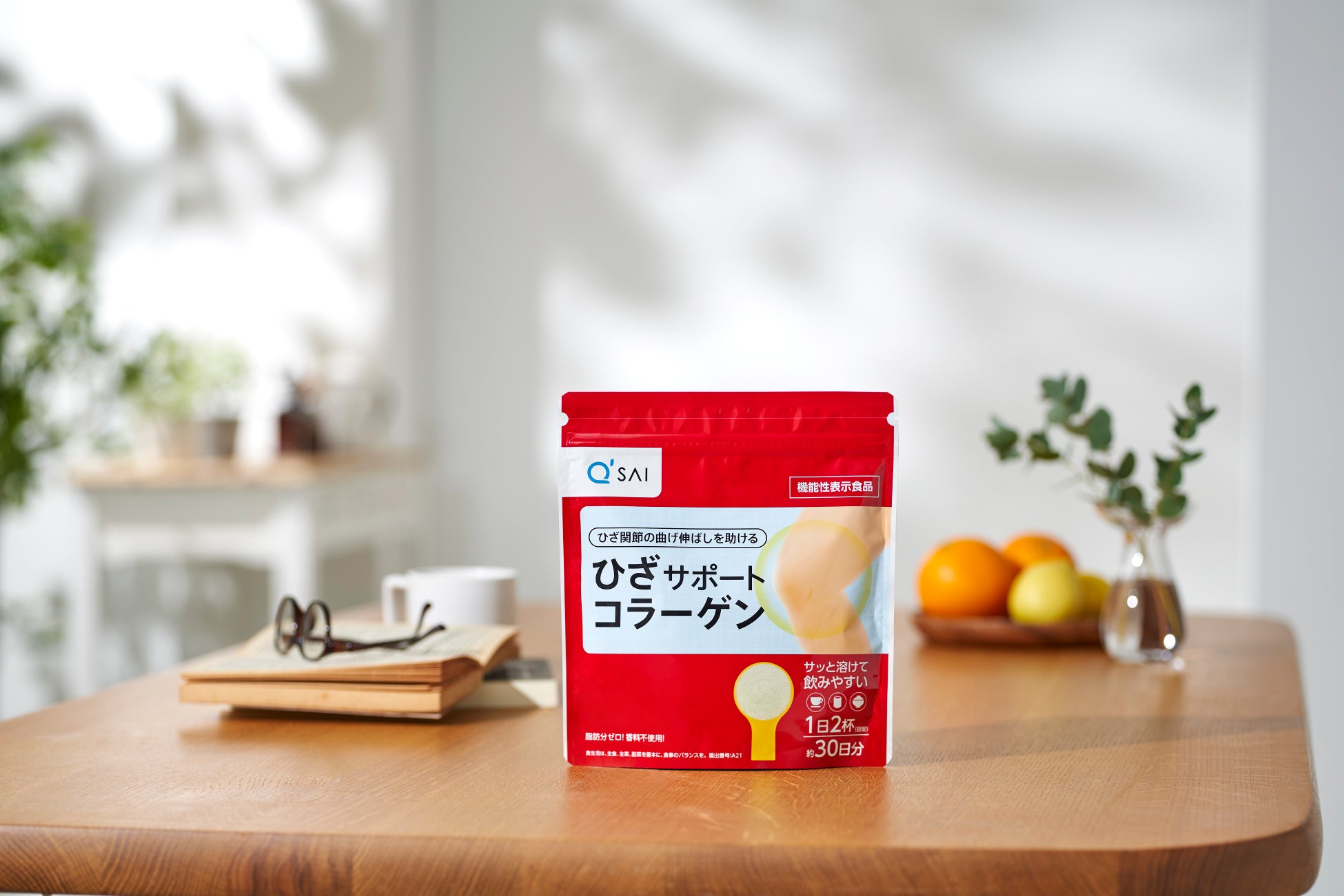 当商品は、ひざ関節の曲げ伸ばしを助ける、コラーゲンペプチド配合の機能性表示食品です。体内のコラーゲンは、軟骨などを形成する、関節にかかる外部の力をクッションのようにしっかり受け止め、軽やかな動きを生み出す重要な成分です。しかし、コラーゲンは年齢とともに減少していき、50歳を超えると20歳の頃の約半分にまでなってしまいます*。これがひざの曲げ伸ばしがつらくなる一因となるため、ひざの曲げ伸ばしがつらくなる前に、早めのケアをすることが重要です。