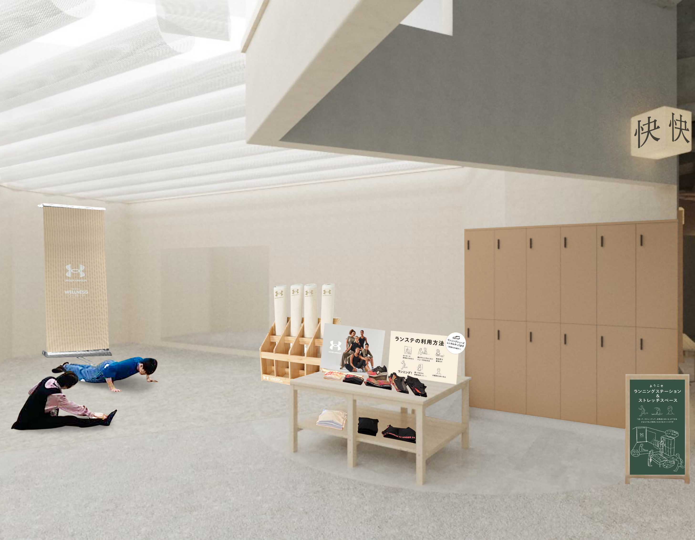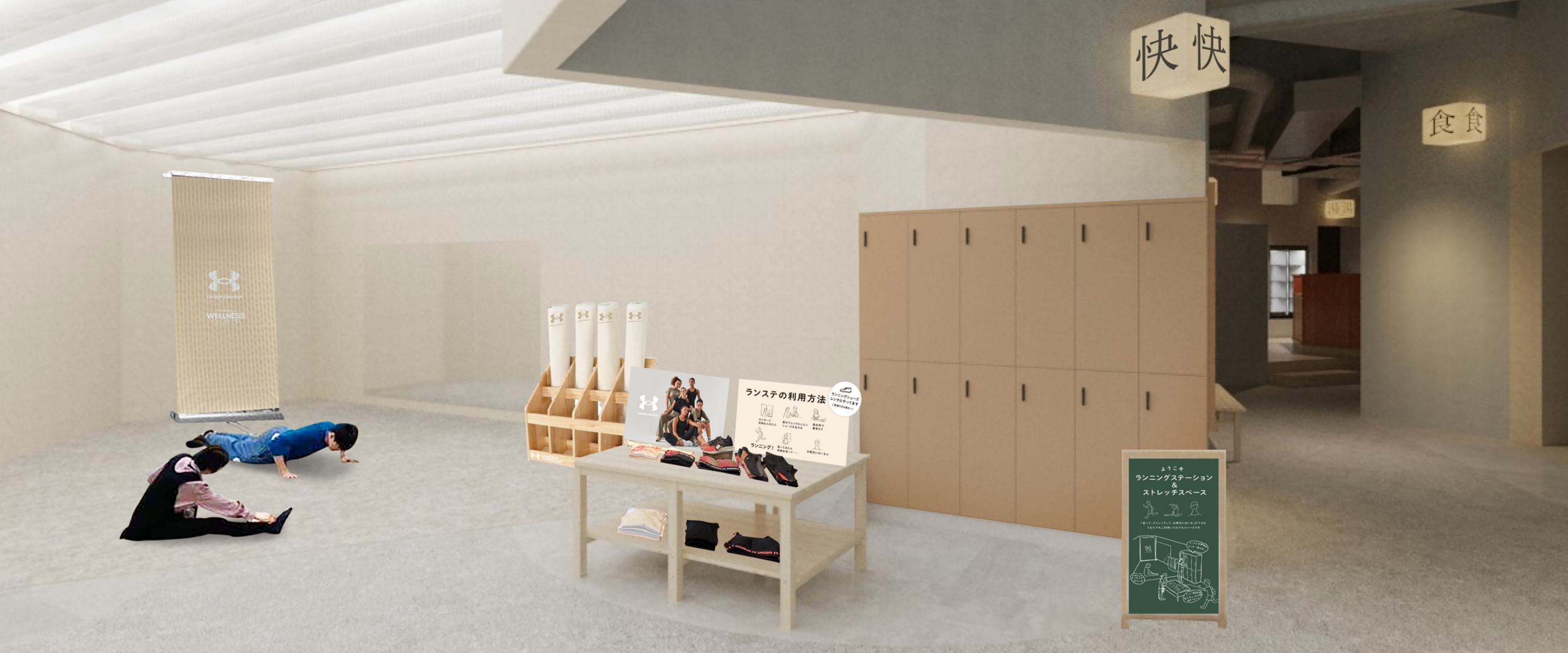 誰でも活用いただける、ランニングロッカーとストレッチスペースを用意しました。普段運動する人も、しない人も。「走ってお風呂に入ったら気持ちが良さそう」そんな思いで、ゆるやかに、チカイチ・アンダーアーマーにお越しください。