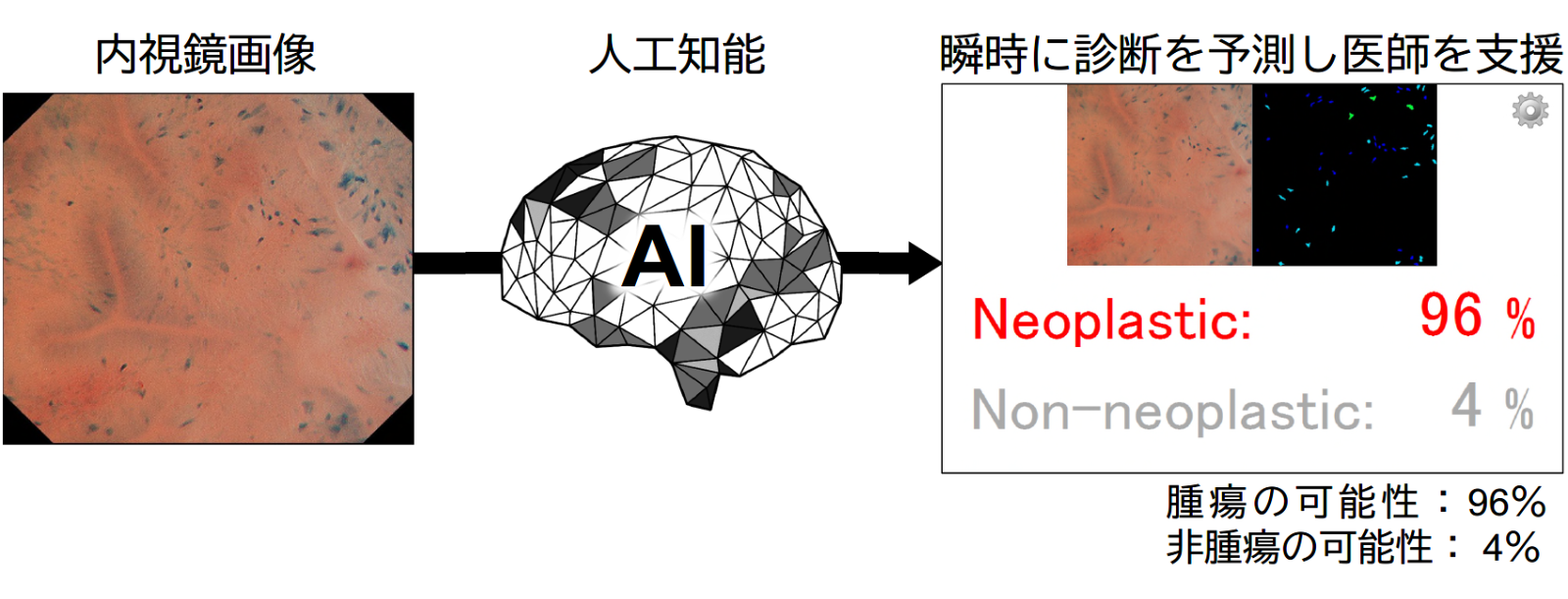 大腸がんは日本人女性のがん死亡数の1位、男性でも3位と増加傾向で、効果的な対策が求められるがんです。その対策として、大腸内視鏡で早期がんや前がん病変である腫瘍性ポリープを切除することで、大腸がんによる死亡を大幅(53-68%)に減らせることが知られています(Zauberら New England Journal of Medicine 2012, Nishihara et al. New England Journal of Medicine 2014)。しかし、大腸ポリープの中には切除する必要のない非腫瘍性ポリープもあるため、大腸内視鏡検査中に切除すべき病変か、経過観察してよい病変かをリアルタイムで見分ける必要があります。