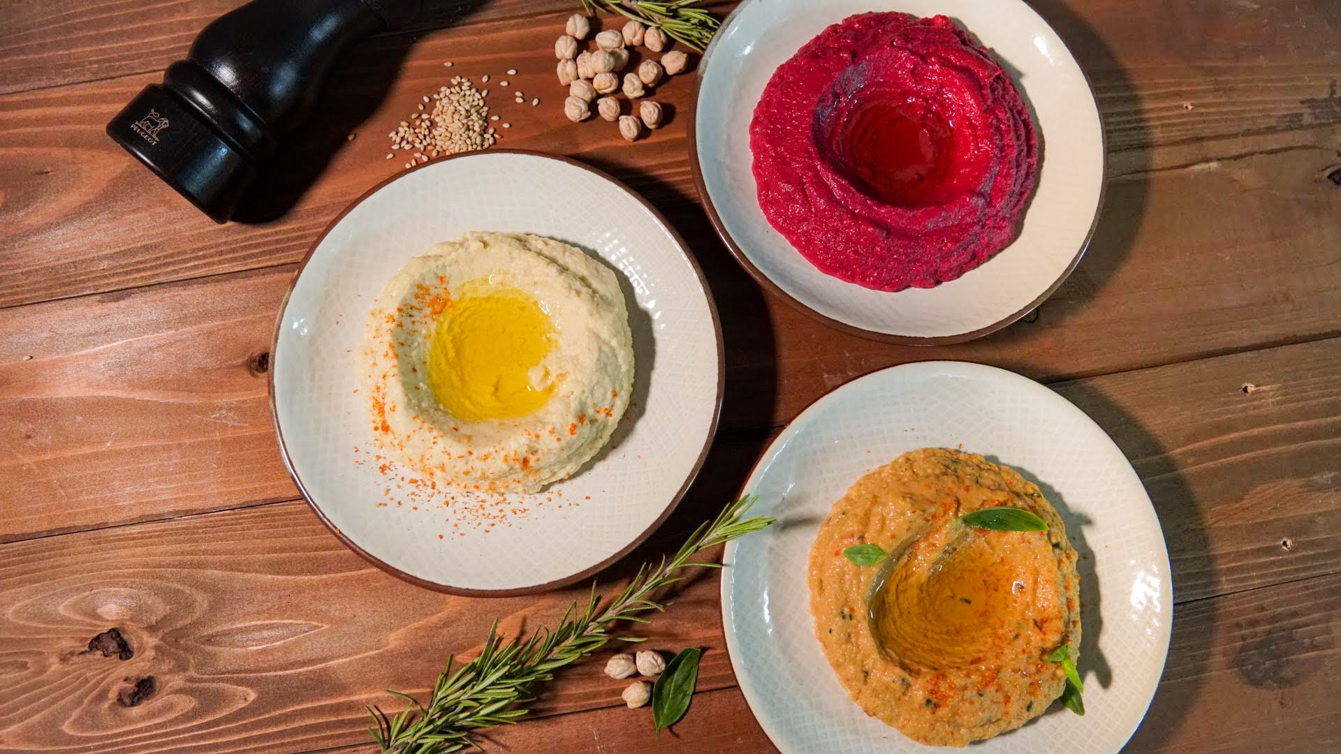 フムス単品 (プレーン, ドライトマト&バジル, ローストビーツ) 各600円