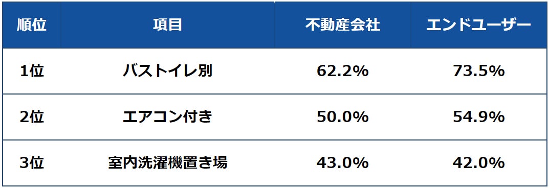 ■妥協できない設備1位、不動産会社・エンドユーザーともに「バストイレ別」