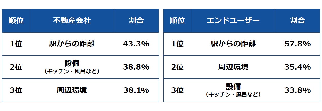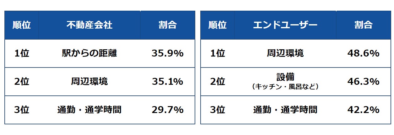 2. 妥協できない条件1位、不動産会社は「駅からの距離」、エンドユーザーは「周辺環境」