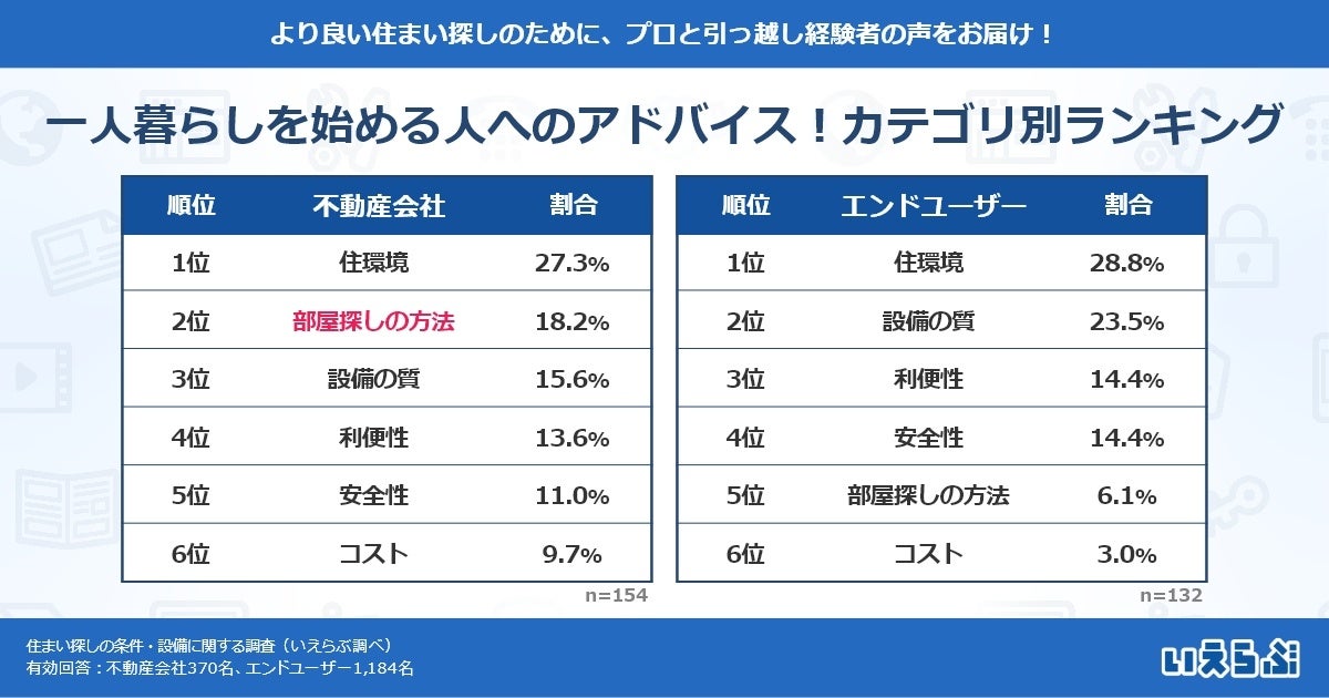 より良い住まい探しのために、不動産会社は「条件設定」をアドバイス、エンドユーザーは「快適さ」|住まい探しの条件・設備に関する調査 いえらぶGROUP