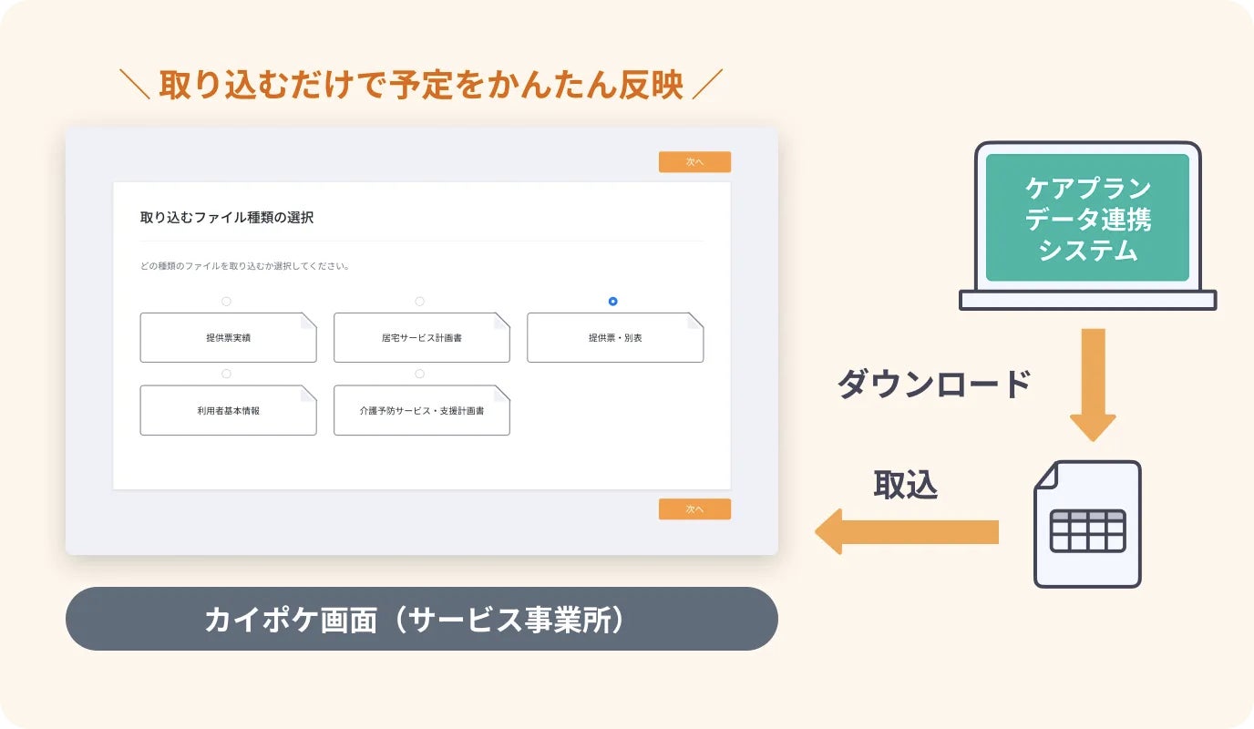 ・ケアプランデータ連携システム対応のCSVを取り込み、予定をカイポケ訪問看護に反映