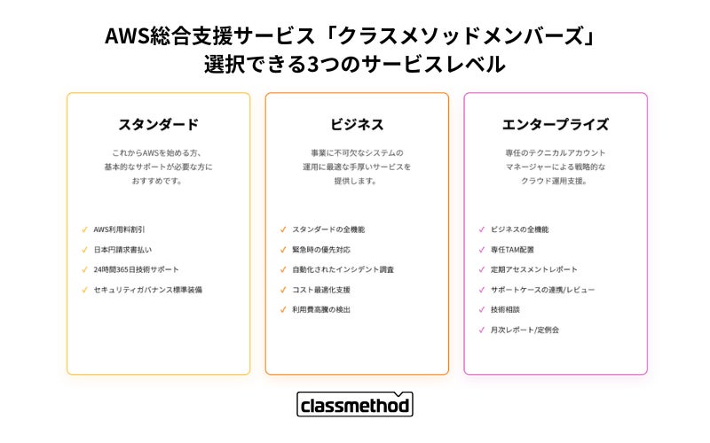 クラスメソッド株式会社(本社:東京都港区、代表取締役:横田聡、以下「クラスメソッド」)は、AWS(アマゾン ウェブ サービス)総合支援サービス「クラスメソッドメンバーズ」を全面リニューアルし、2025年11月より提供開始します。今回の刷新により、企業の体制やクラウド上で稼働するワークロードの重要度に応じた最適なサービスが選択可能になります。
