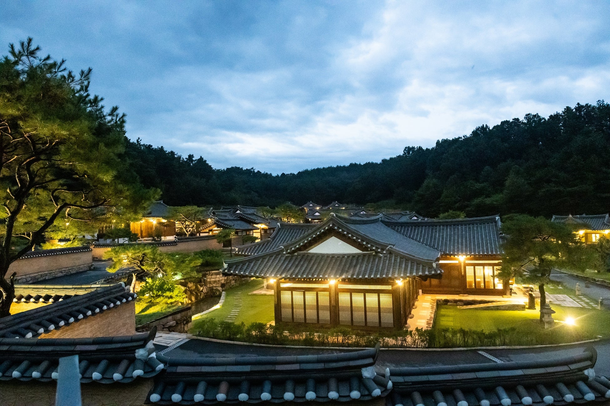 今回の旅の大きなハイライトのひとつが、「Rakkojae Hahoe Hanok Hotel」での宿泊体験でした。この宿泊施設は、韓国の伝統建築を現代の旅行者の視点から再解釈した韓屋で、ユネスコ世界遺産に登録され、「蓮の花の川に浮かぶ村」とも称される河回村に位置しています。洛東江の穏やかな流れを映す小川に囲まれたこの場所は、自然と調和した静謐な空間を形成しています。各韓屋は一棟一棟丁寧に設計され、窓や中庭からはそれぞれ異なる魅惑的な景色が広がります。訪れる人は、まるで絵画のような景観に包まれながら、村の自然美とともに過ごすひとときを堪能することができます。