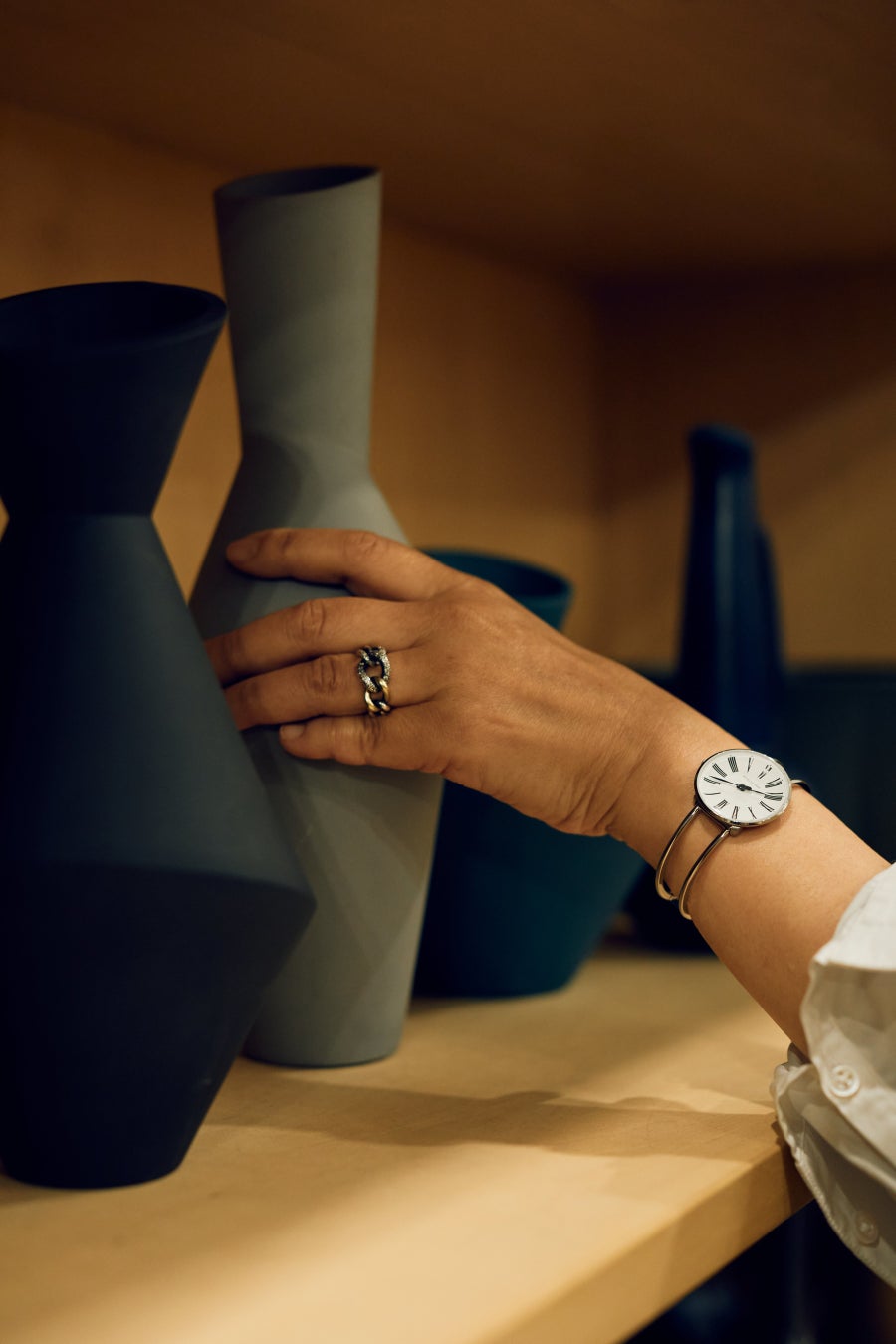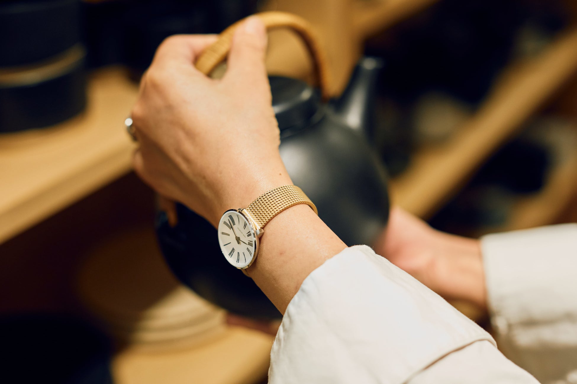 それぞれが歴史的なヤコブセンのクロックデザインから、ローマン体のインデックスをシンプルに配置し、特徴的な針の形状が全体に気品ある印象を感じさせる「ROMAN/ローマン」をセレクト。
