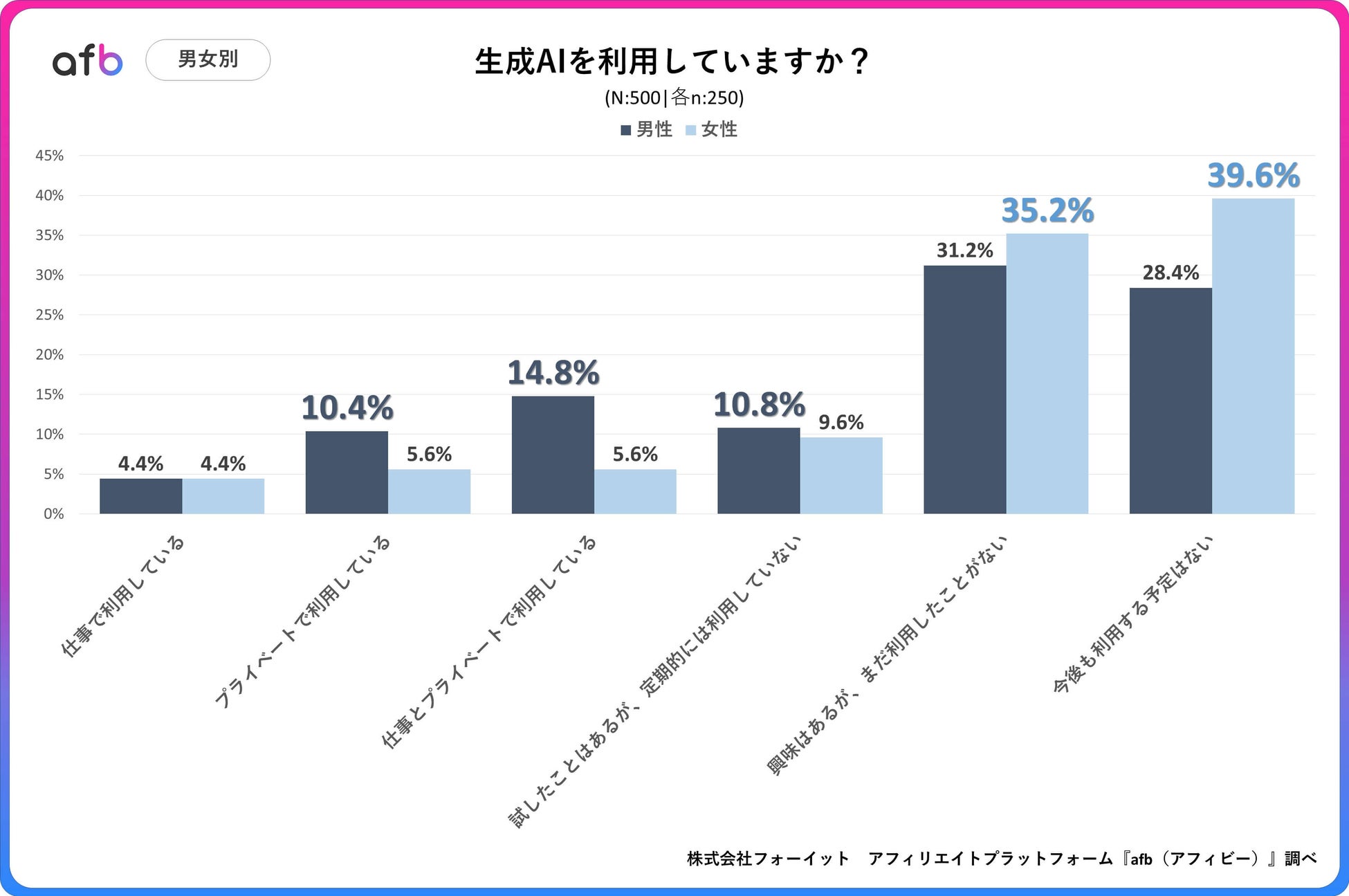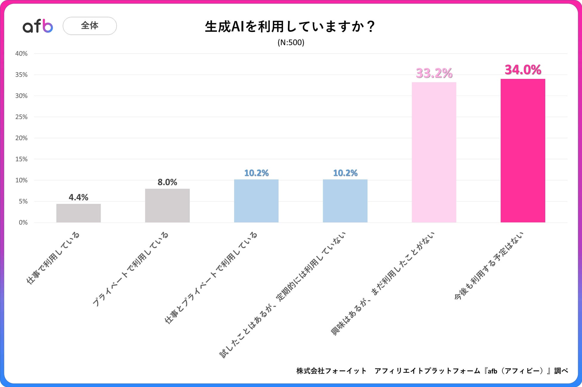 アフィリエイトプラットフォーム「afb(アフィビー)」< https://www.afi-b.com/ >の開発運用をおこなう株式会社フォーイットは、全国の20代~60代までの男女500人を対象に生成AIに関するアンケートを実施し、年代別等の特徴についてまとめました。