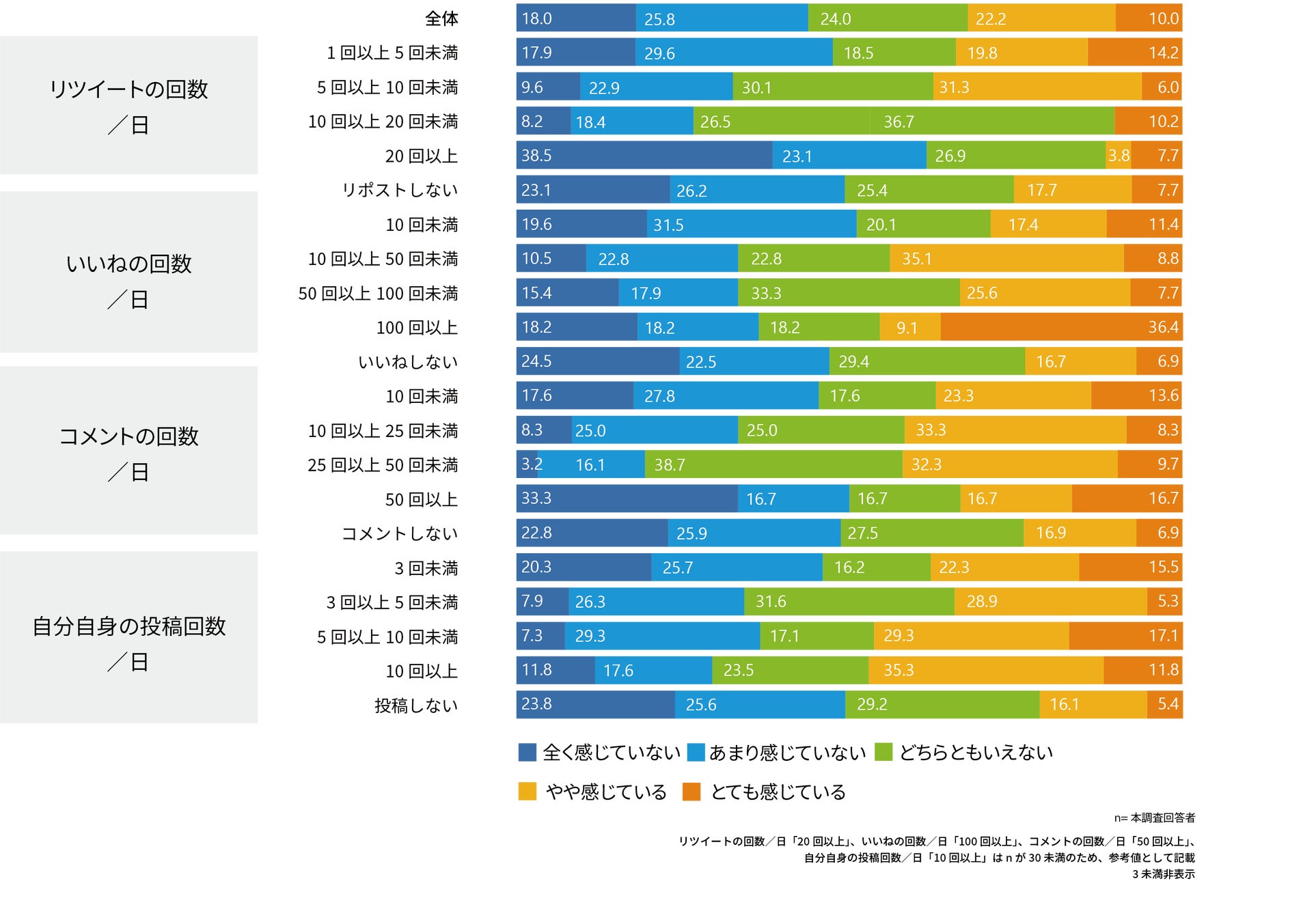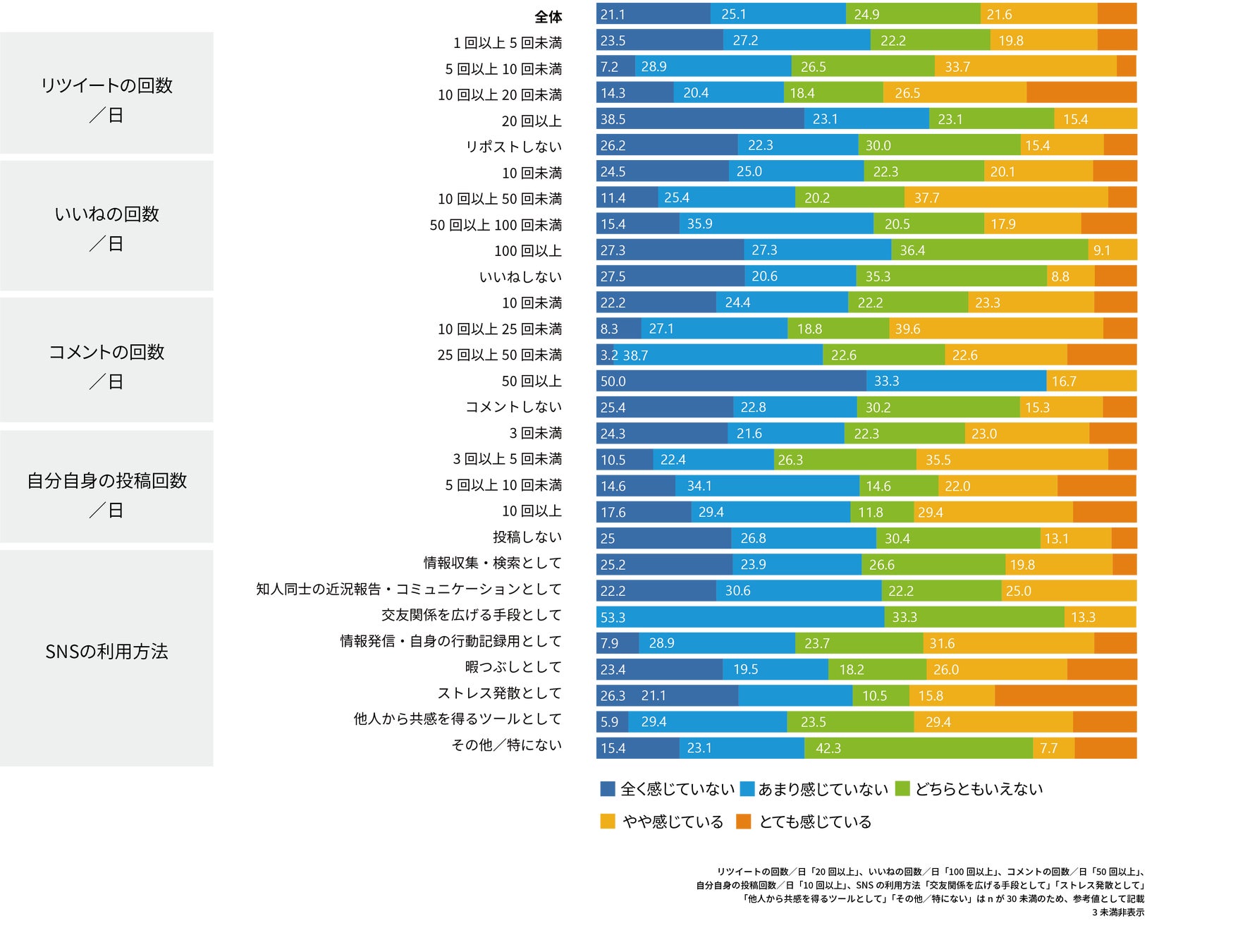 一方で、「いいね」「コメント」が多い層はSNS疲れを感じていない傾向が高い。