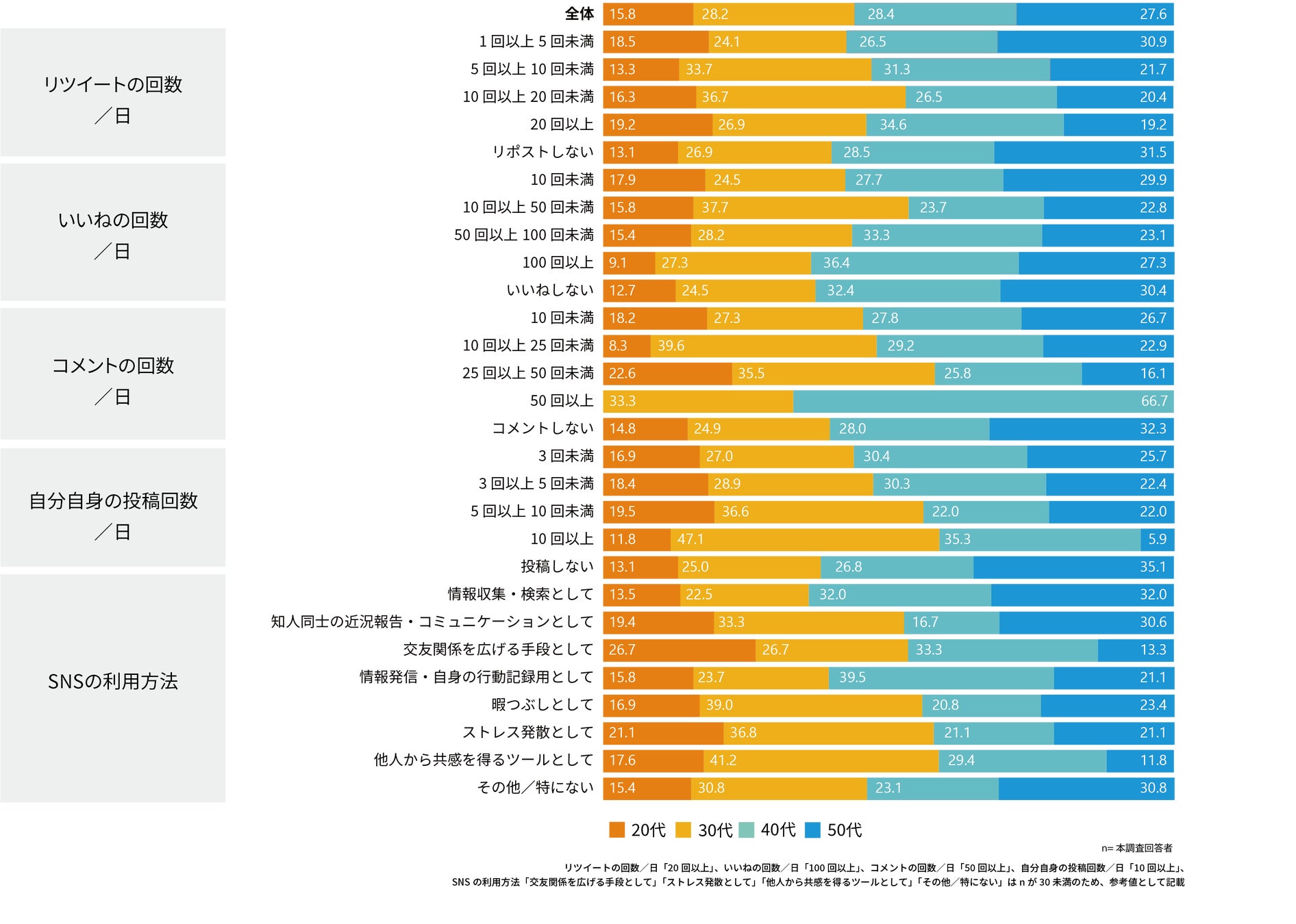全体的に、30代の使用頻度が高く、「暇つぶしとして」「知人同士の近況報告・コミュニケーションとして」使用している傾向がみられる。40代は、「情報発信・自身の行動記録用として」使用している傾向が高い。