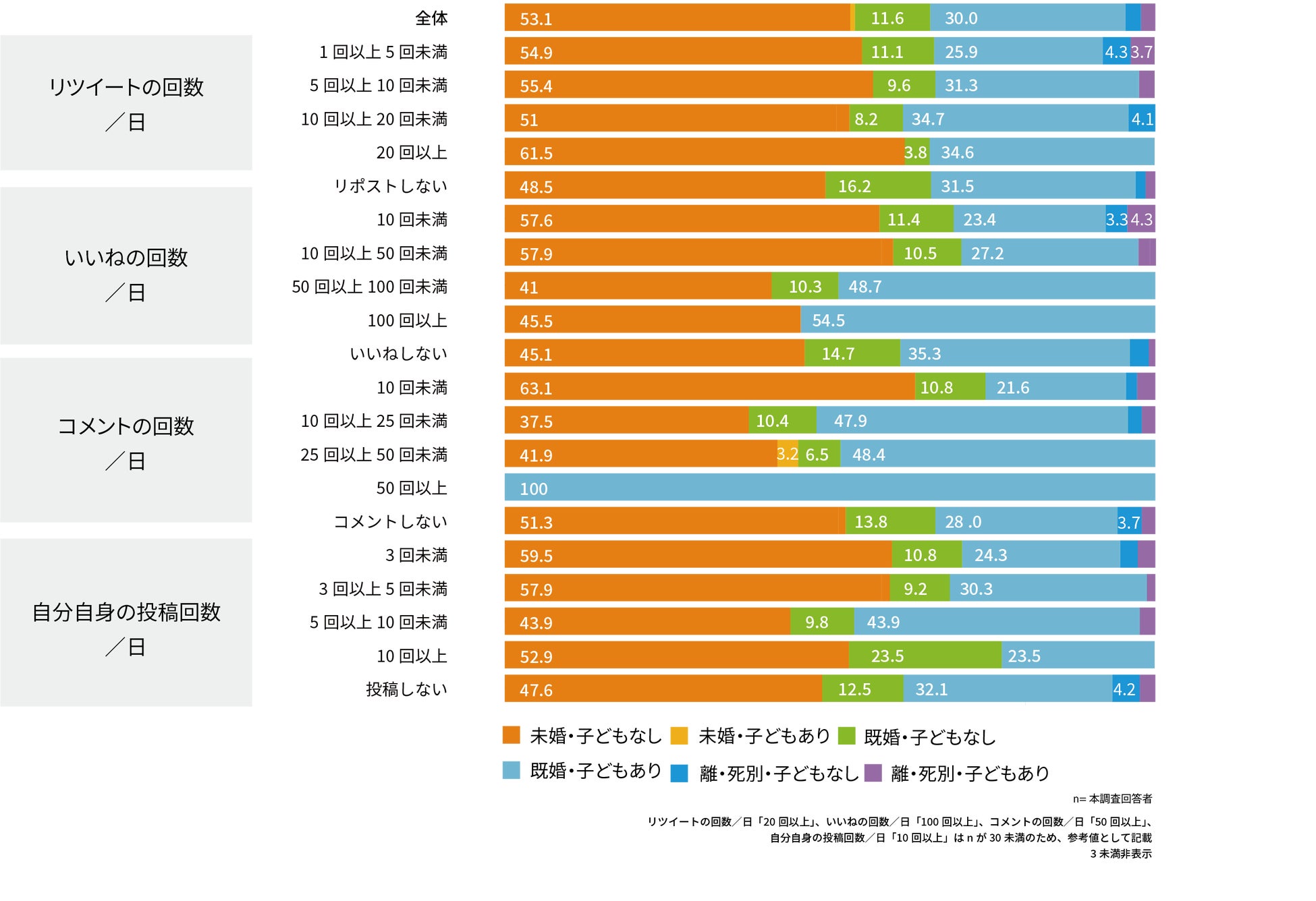 全体に比べ、「既婚・子どもあり」の層の使用頻度が高く、内容としては、「いいね」「コメント」「自分自身の投稿」が多い。