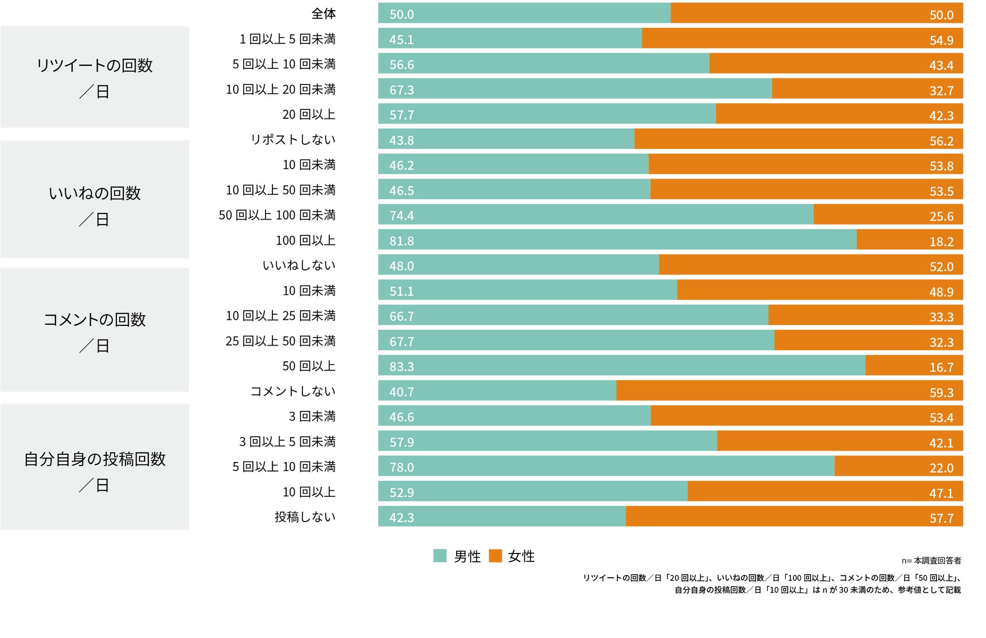 「リツイート(リポスト)」「いいね」「コメント」「自分自身の投稿」全ての項目において、女性より男性の方が使用している