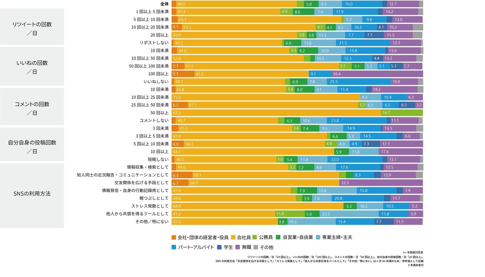 「会社員」の層の使用頻度が高く、内容としては、「いいね」「コメント」「自分自身の投稿」が多い