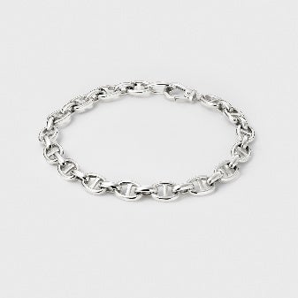 装飾を削ぎ落とし、素材と構造の美しさに立ち返る、繊細さと重厚さを併せ持つ、静かで力強いブレスレットコレクションです。オリジナルのアンカーチェーンを基軸に、サイズ違いやエンドパーツのディテールで個性を加え、選ぶ人のスタイルにそっと馴染みながらも、確かな存在感を放つ一本になっています。装着感とデザイン性を兼ね備えた、4℃ HOMME+らしいコレクション。