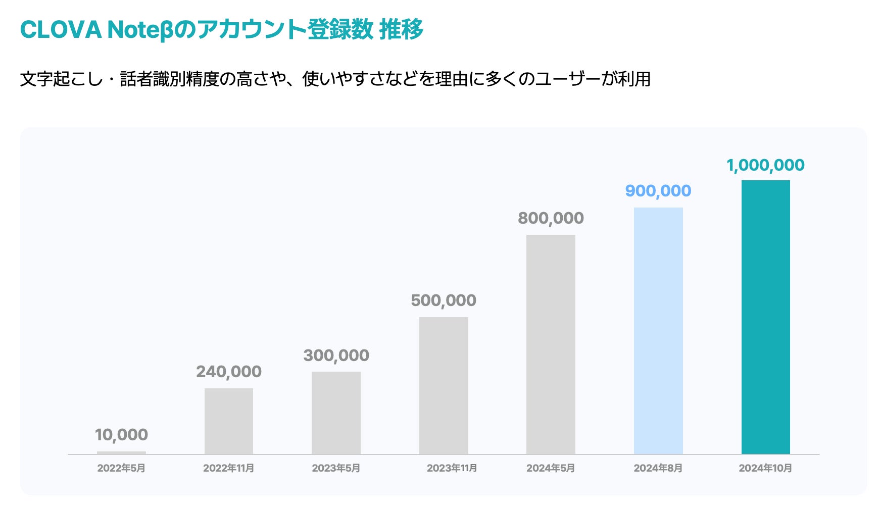 2022年5月より提供してきた、AI技術活用により音声を文字に変換し記録を管理するサービス「CLOVA Note β」は文字起こし、話者識別の高さや、使いやすさなどで高い評価を受け、アカウント登録者数が100万人(2024年10月時点)を突破いたしました。