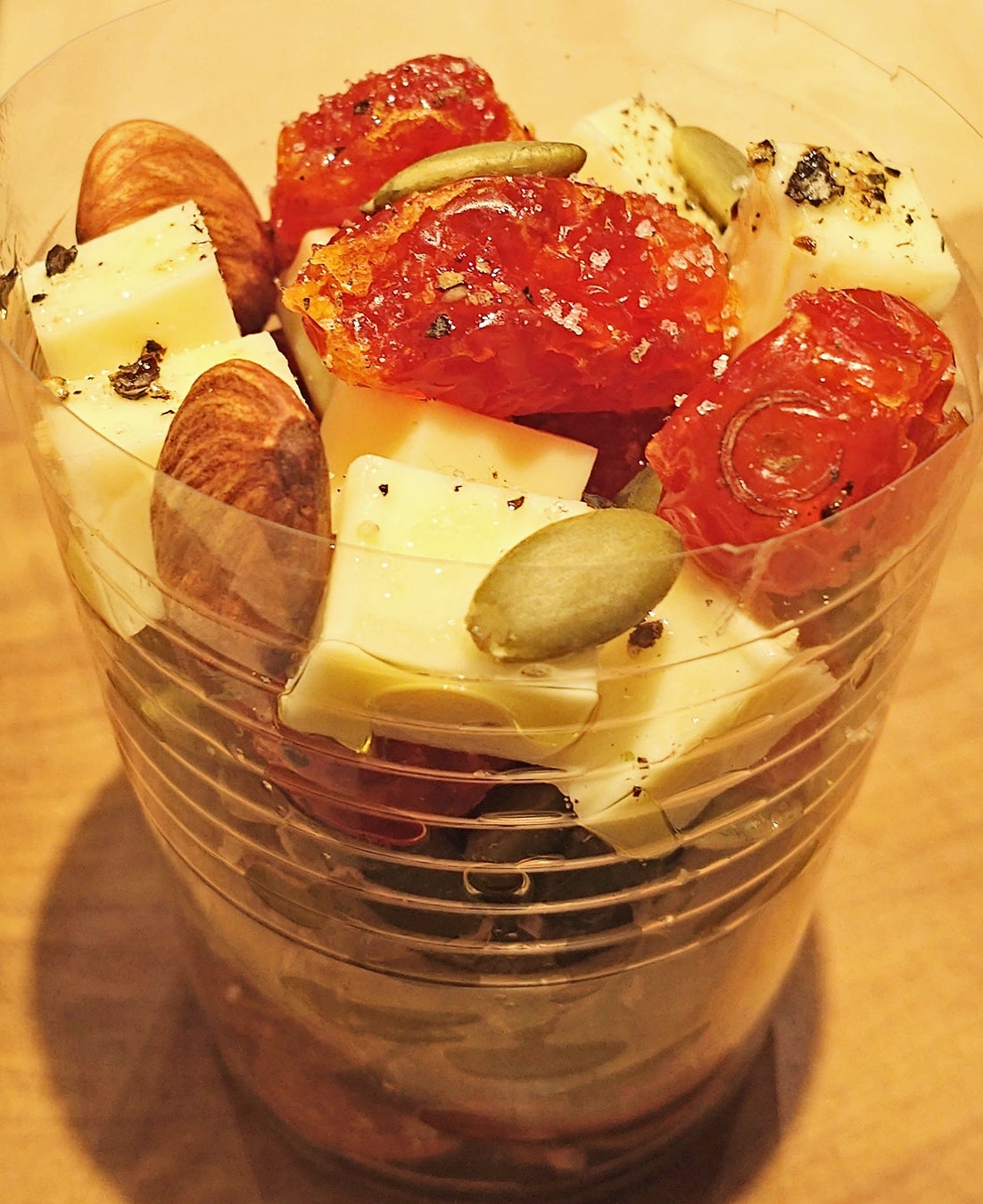 ドライフルーツのトマト、アーモンド、パンプキンシード、チーズに塩胡椒。シャカシャカ振って召し上がれ!