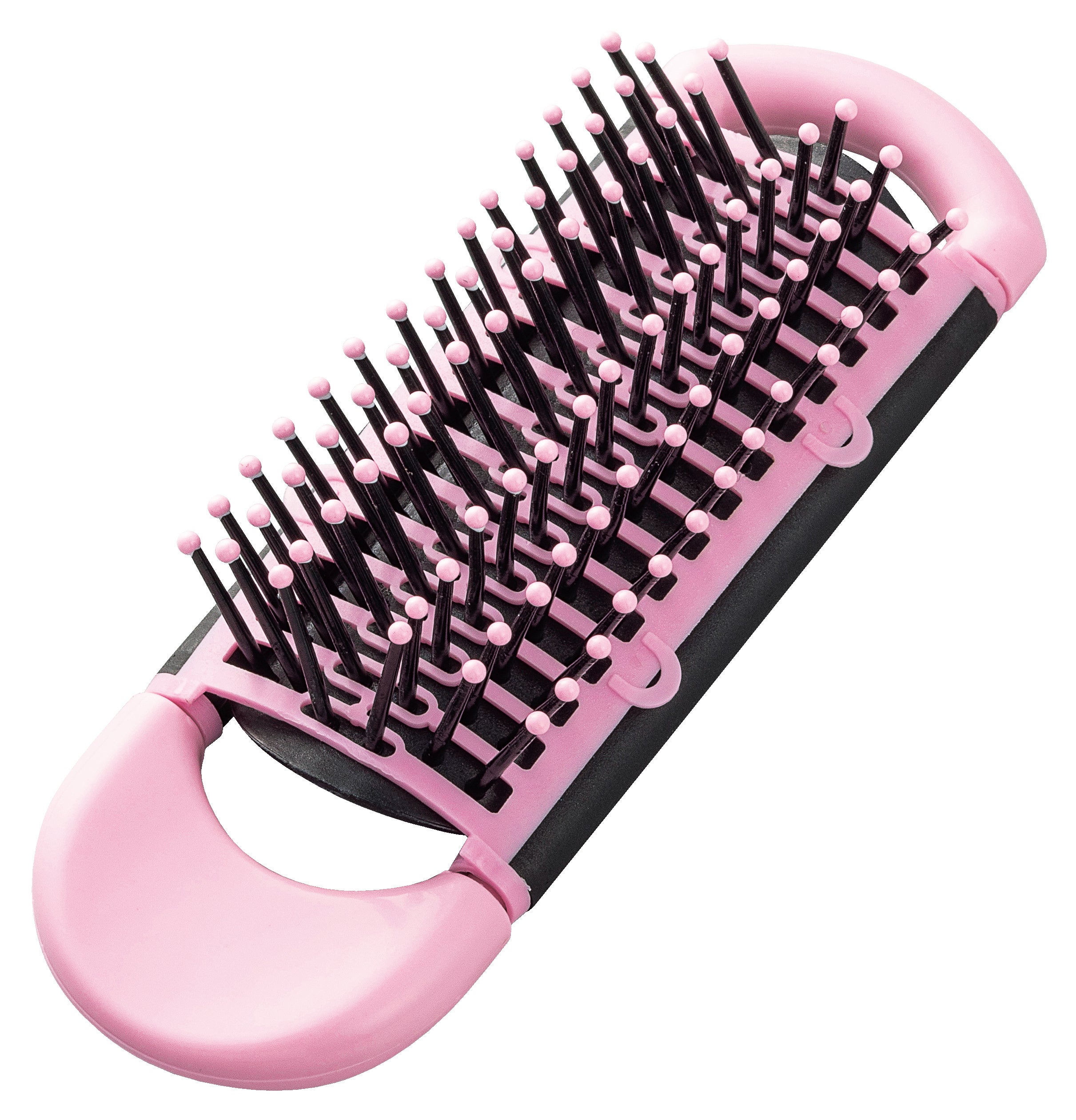左右から押すとブラシ部が折りたためる、ポーチ収納や携帯性に優れたコンパクトサイズのヘアブラシ。