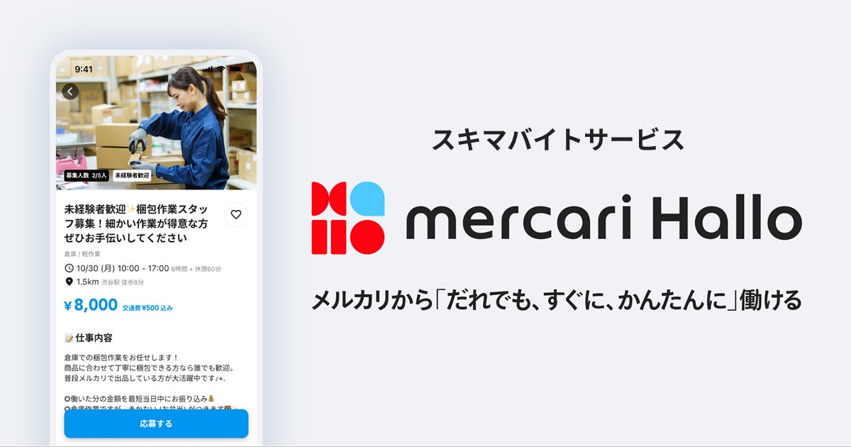 株式会社メルカリは、今後も「メルカリ ハロ」の導入パートナーを増やし、求人の拡大を積極的に行うことによって、スキマバイトを広く普及し、「働く」をより気軽なものにすることで、それぞれの好きなことや、やりたいことの実現の後押しをしてまいります。