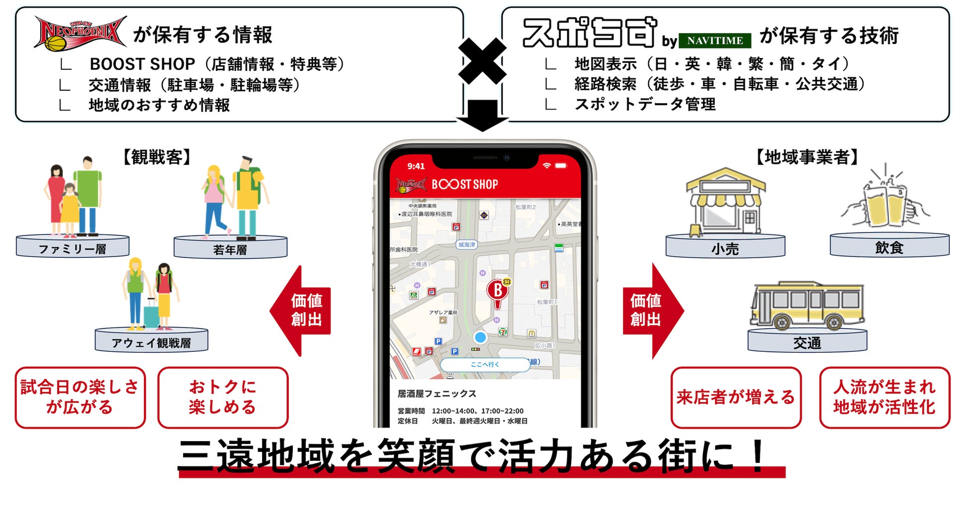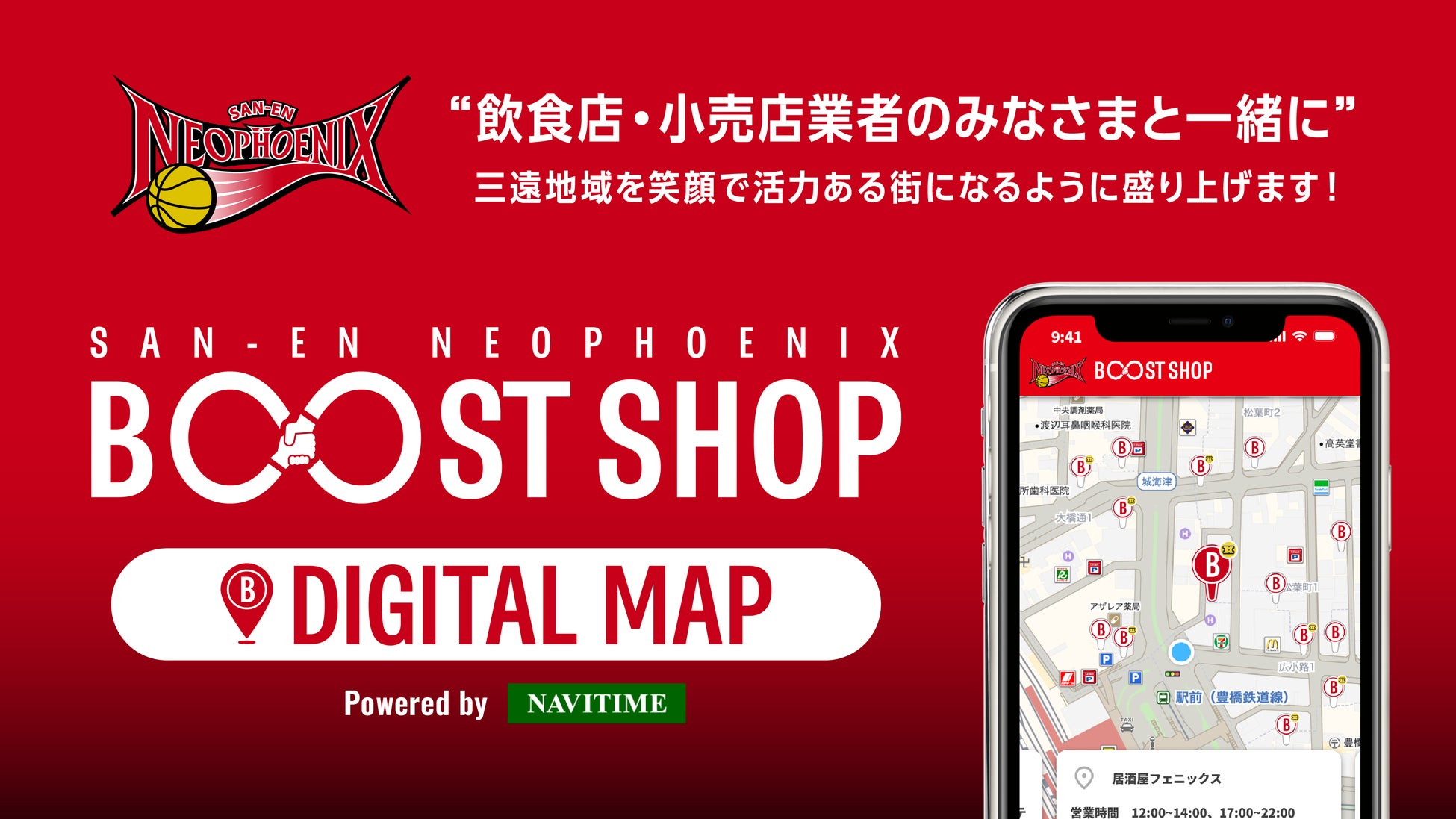 三遠ネオフェニックスとナビタイムジャパンが共同で、地域経済活性化を目的とした「BOOST SHOPデジタルマップ 」を提供開始
