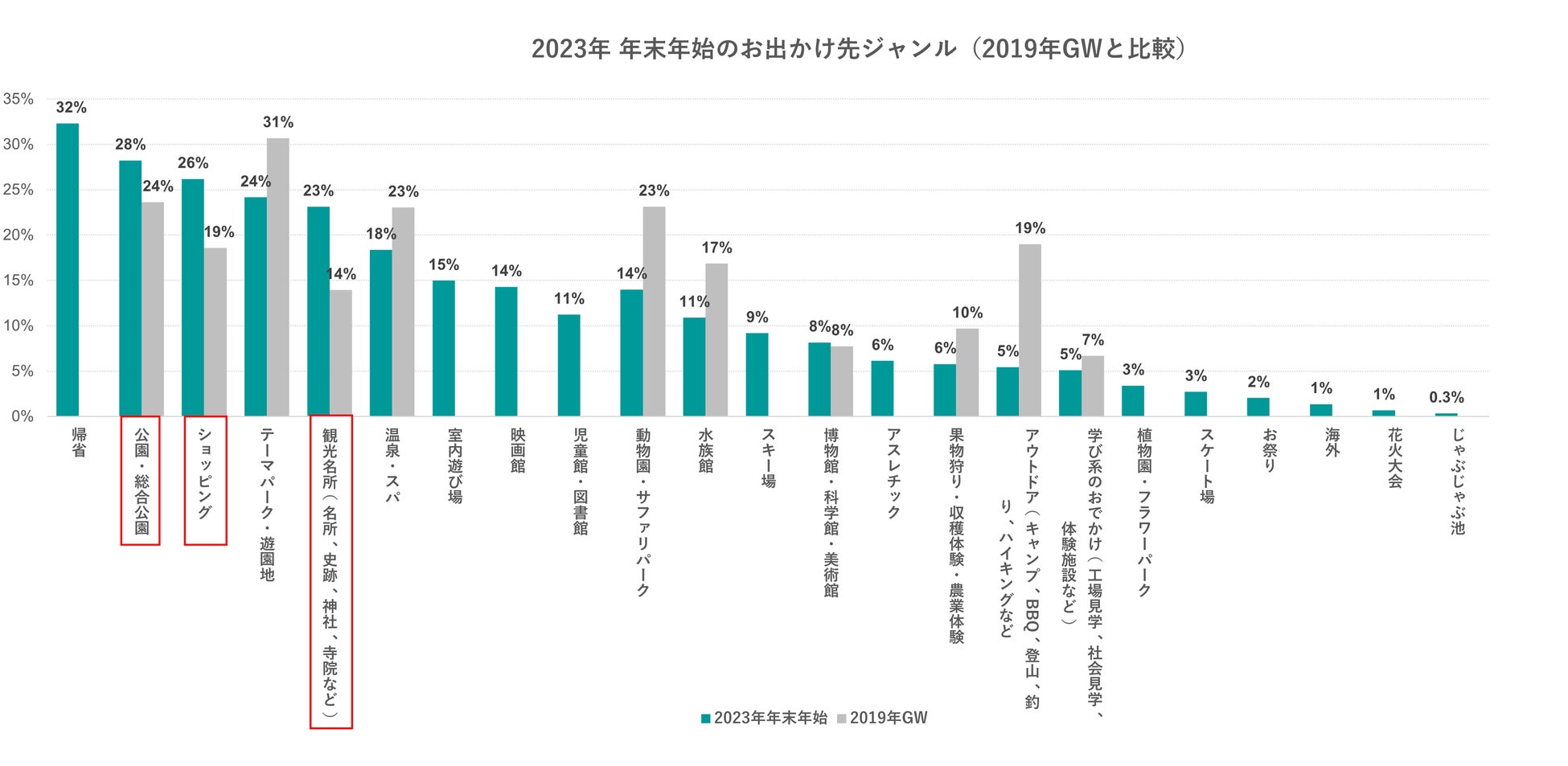 年末年始は帰省する人が多く、人気お出かけ先は公園やショッピングなどの近隣