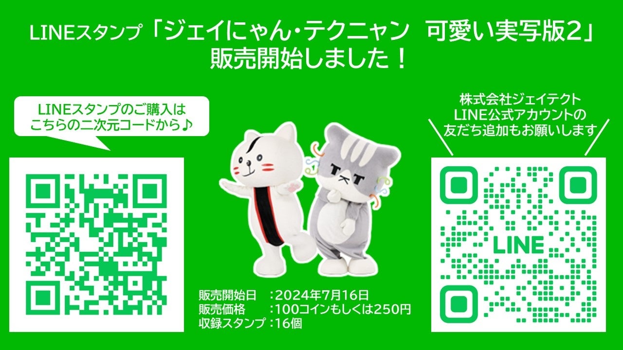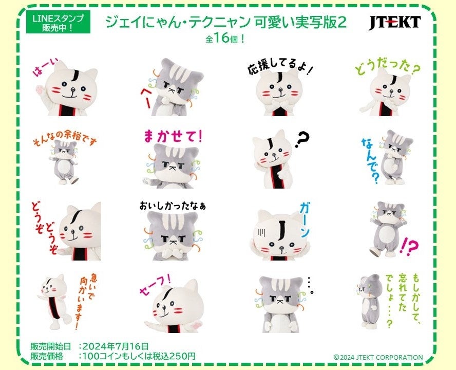 株式会社ジェイテクト(本社:愛知県刈谷市、取締役社長:近藤 禎人、以下「ジェイテクト」)は、LINEヤフー株式会社が運営するコミュニケーションアプリ「LINE」において、LINEスタンプ「ジェイにゃん・テクニャン 可愛い実写版2」を2024年7月16日より販売開始しました。
