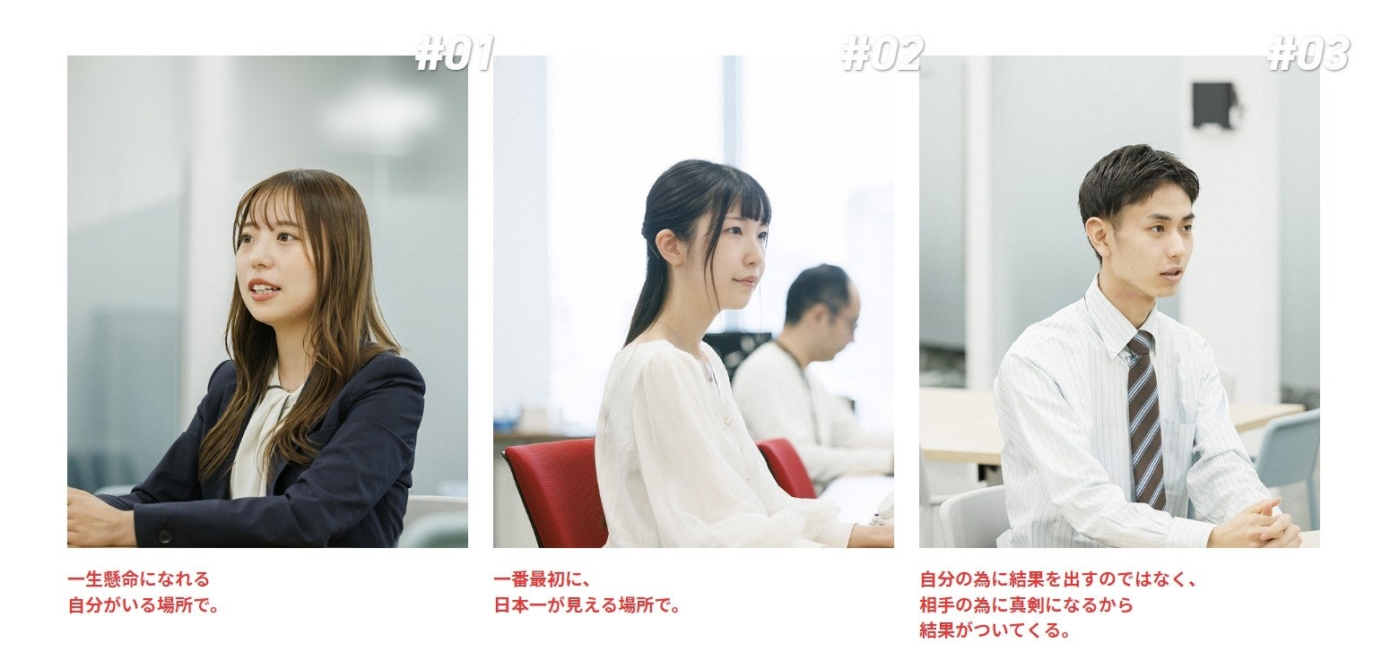 当社が目指す目標に対して仕事への向き合い方や魅力、楽しさ、社風などを各部署で働く社員がインタビュー形式で現場の目線からご紹介しています。インタビューを通して、それぞれの役割や目標、仕事内容が分かりやすく見える設計にしています。